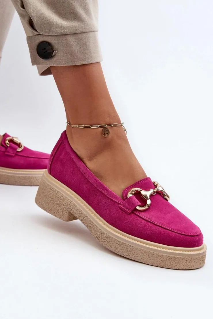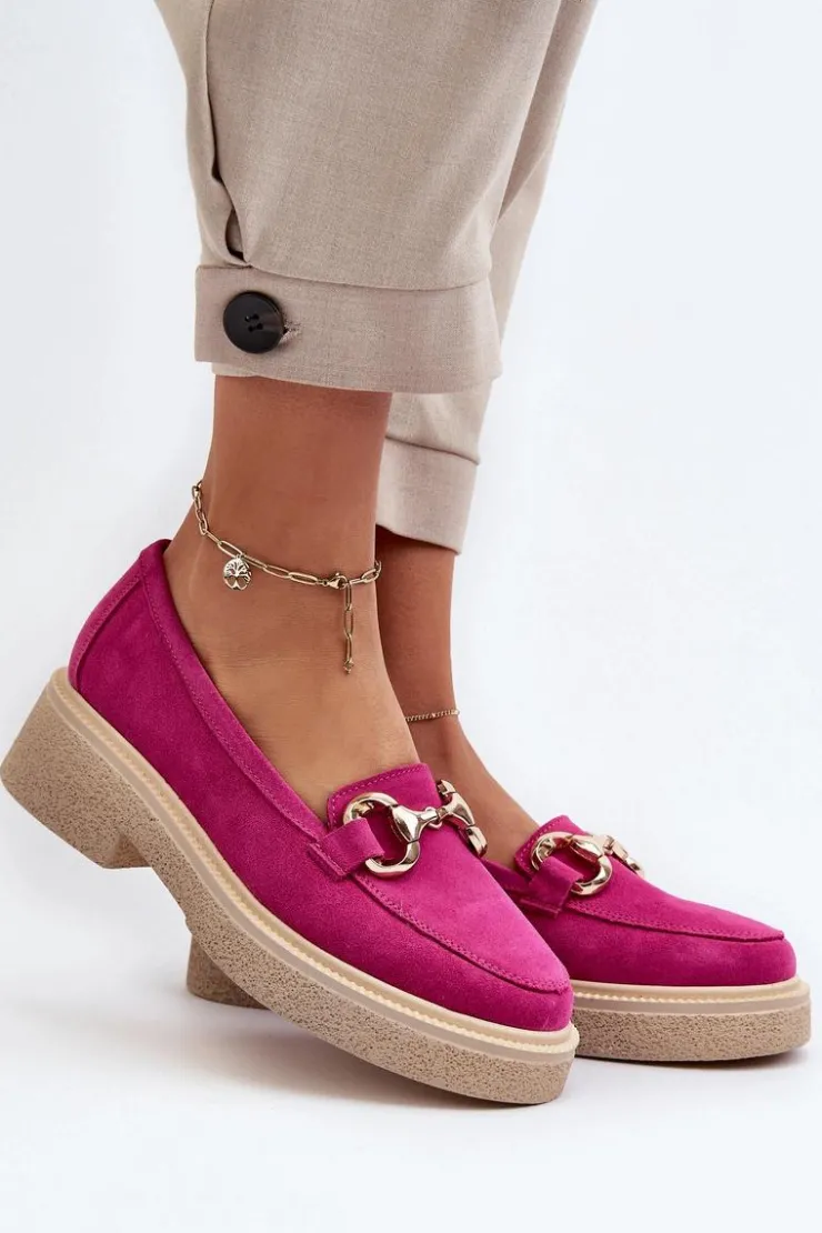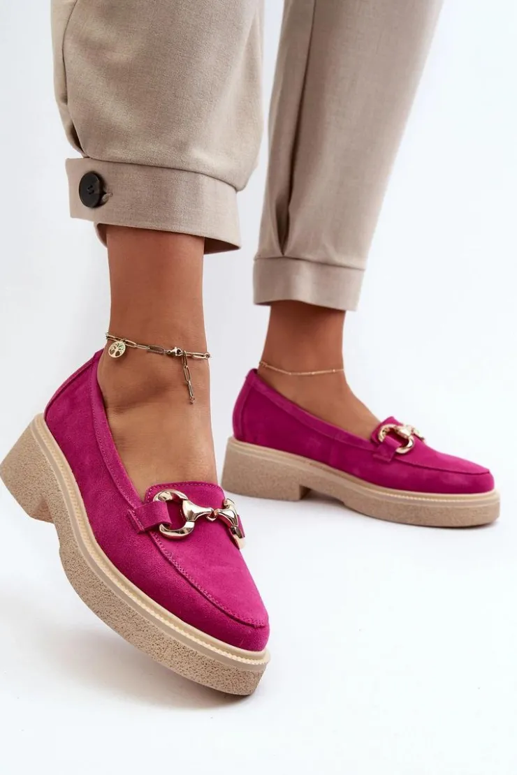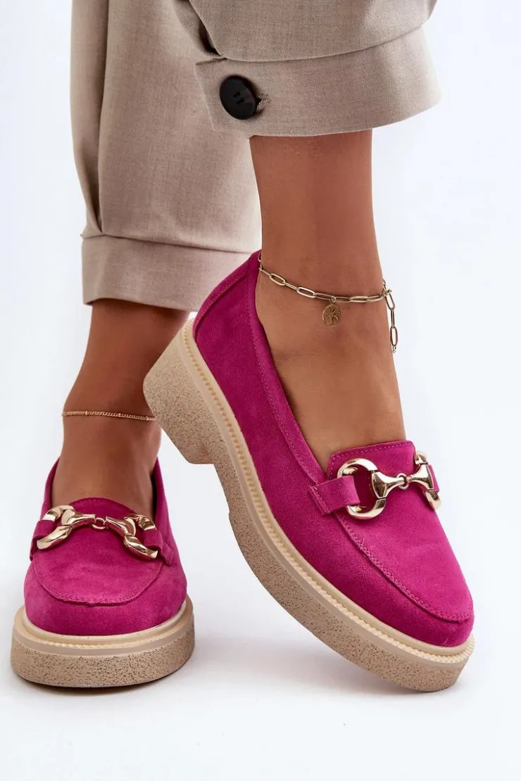 Te eleganckie mokasyny damskie wykonane z naturalnego zamszu są nie tylko wyjątkowo stylowe, ale także niezwykle wygodne. Ich przód ozdobiony jest złotą ozdobą, która dodaje im nutę luksusu i elegancji. Osadzone na platformie i płaskim obcasie. Profilowana wkładka zapewni wygodę podczas użytkowania. Niezwykle modny fason, który wykorzystasz do wielu stylizacji! Przy wyborze rozmiaru prosimy sugerować się tabelą rozmiarów.