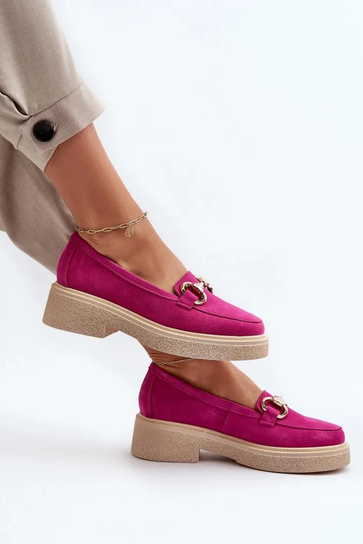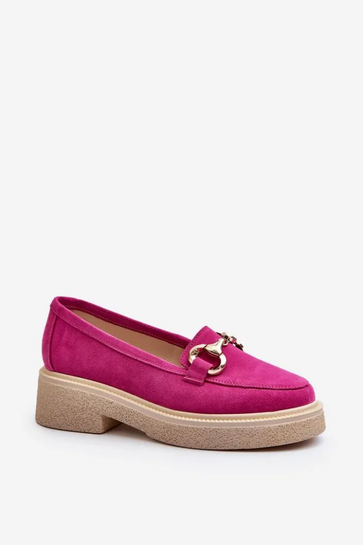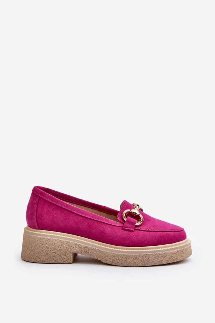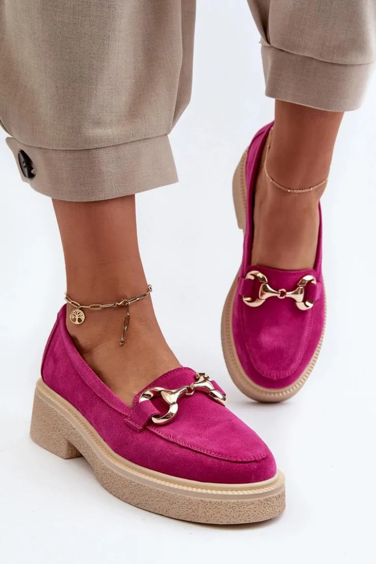 Te eleganckie mokasyny damskie wykonane z naturalnego zamszu są nie tylko wyjątkowo stylowe, ale także niezwykle wygodne. Ich przód ozdobiony jest złotą ozdobą, która dodaje im nutę luksusu i elegancji. Osadzone na platformie i płaskim obcasie. Profilowana wkładka zapewni wygodę podczas użytkowania. Niezwykle modny fason, który wykorzystasz do wielu stylizacji! Przy wyborze rozmiaru prosimy sugerować się tabelą rozmiarów.