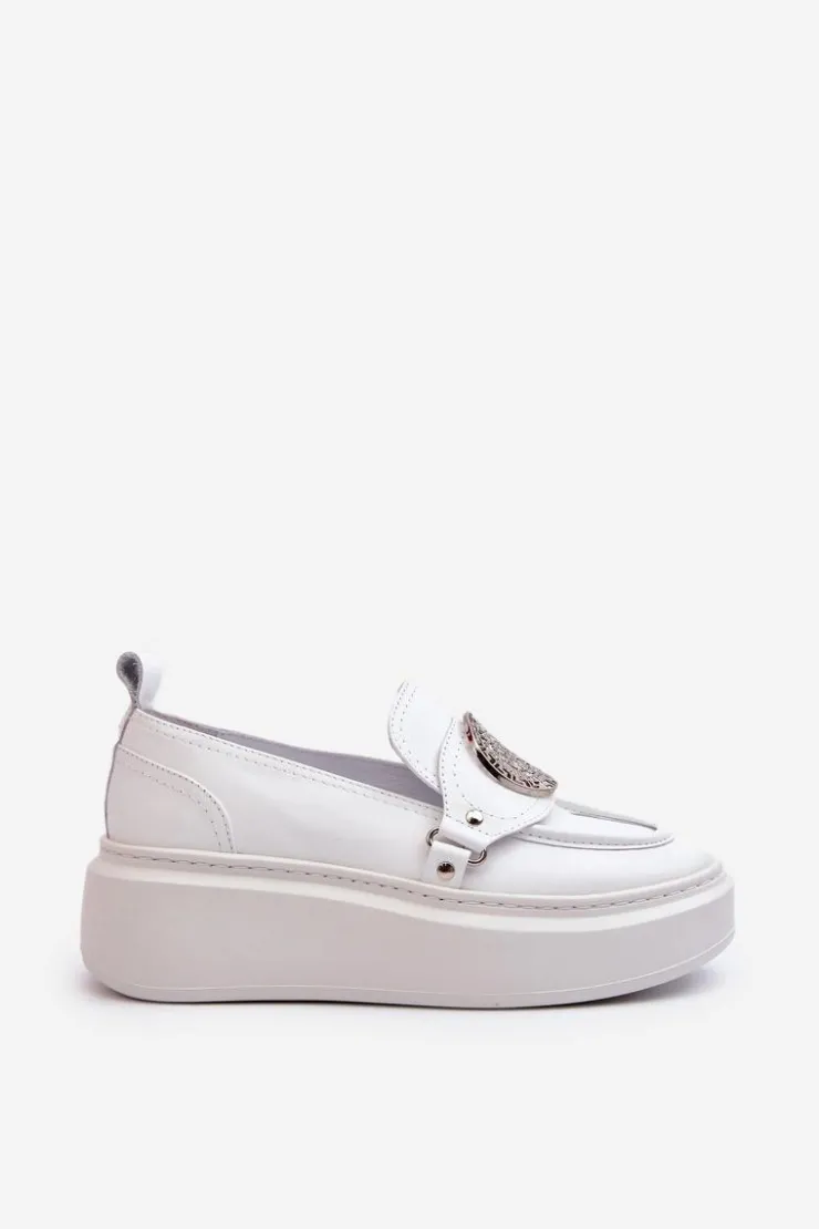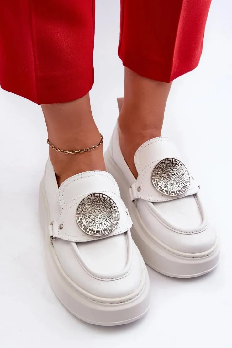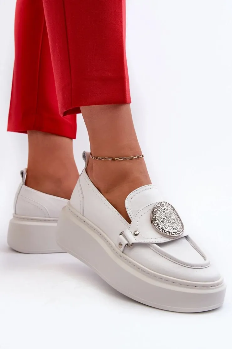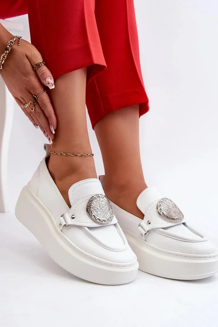 Damskie mokasyny zostały wykonane z naturalnej skóry z dbałością o detale. Osadzone na platformie z koturnem, zapewniają stabilność i pewność kroku. Przód ozdobiony paskiem i srebrną ozdobą, która dodaje elegancji. Doskonałe dla kobiet ceniących styl i wygodę! Przy wyborze rozmiaru prosimy sugerować się tabelą rozmiarów.