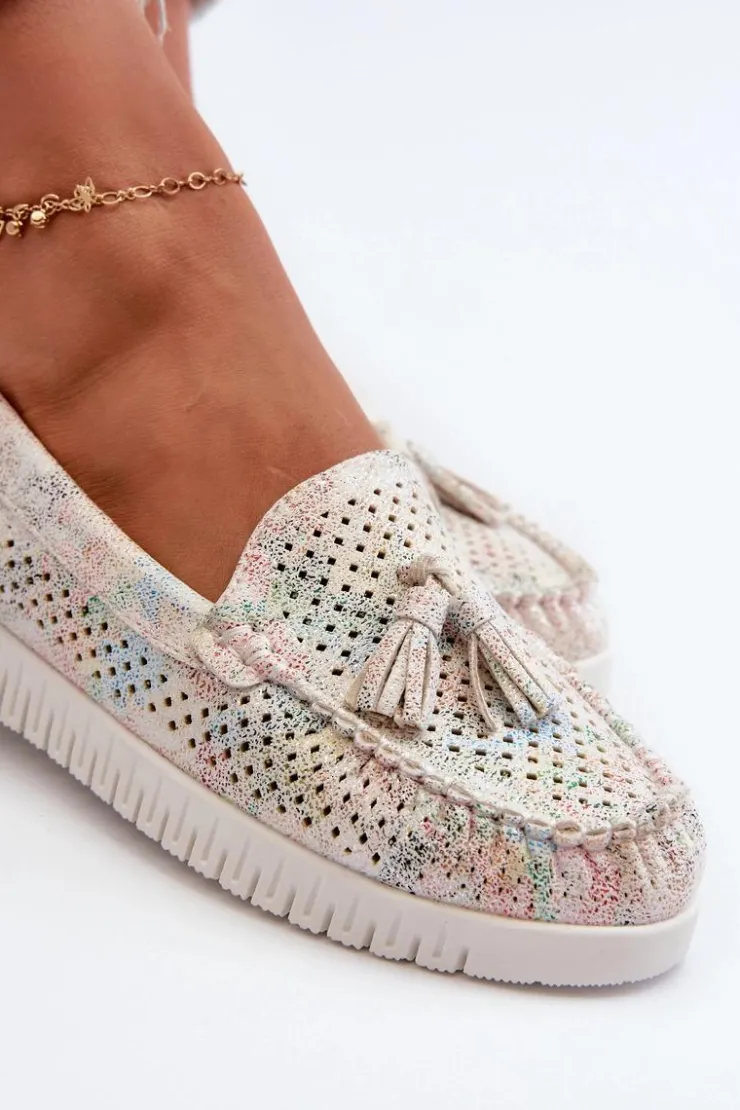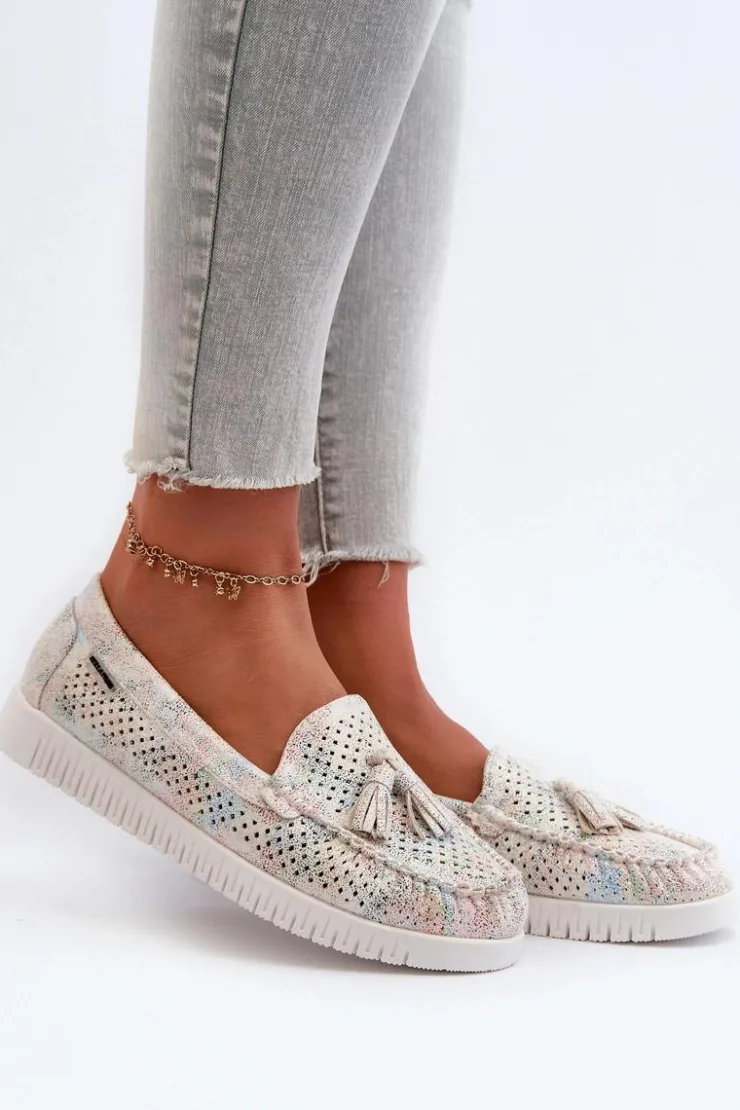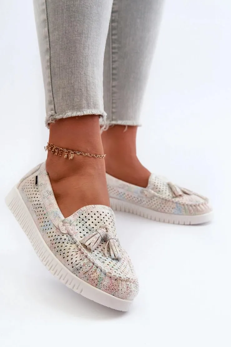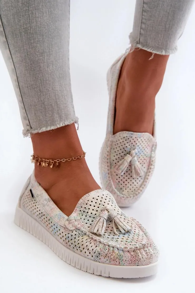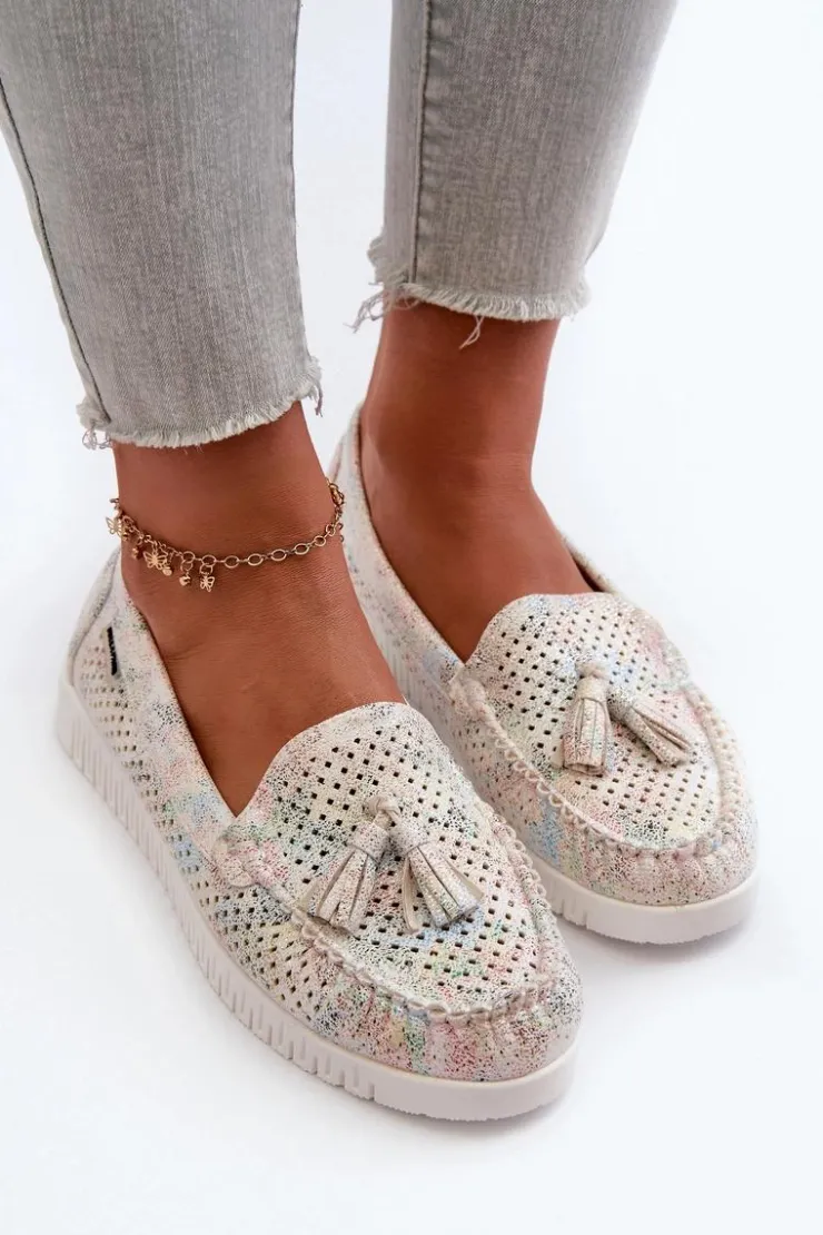 Mokasyny damskie wykonane z ekologicznej skóry. Osadzone na platformie. Noski zaokrąglone. Przód ozdobiony małymi frędzlami. Model ten posiada miękką wkładkę ze skóry naturalnej, która zapewni wygodę podczas noszenia. Klasyczny fason, który dopasujesz do casualowych oraz eleganckich stylizacji. Przy wyborze rozmiaru prosimy sugerować się tabelą rozmiarów.