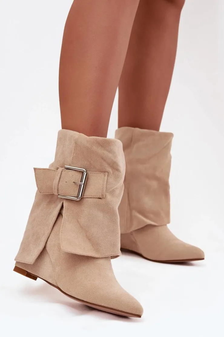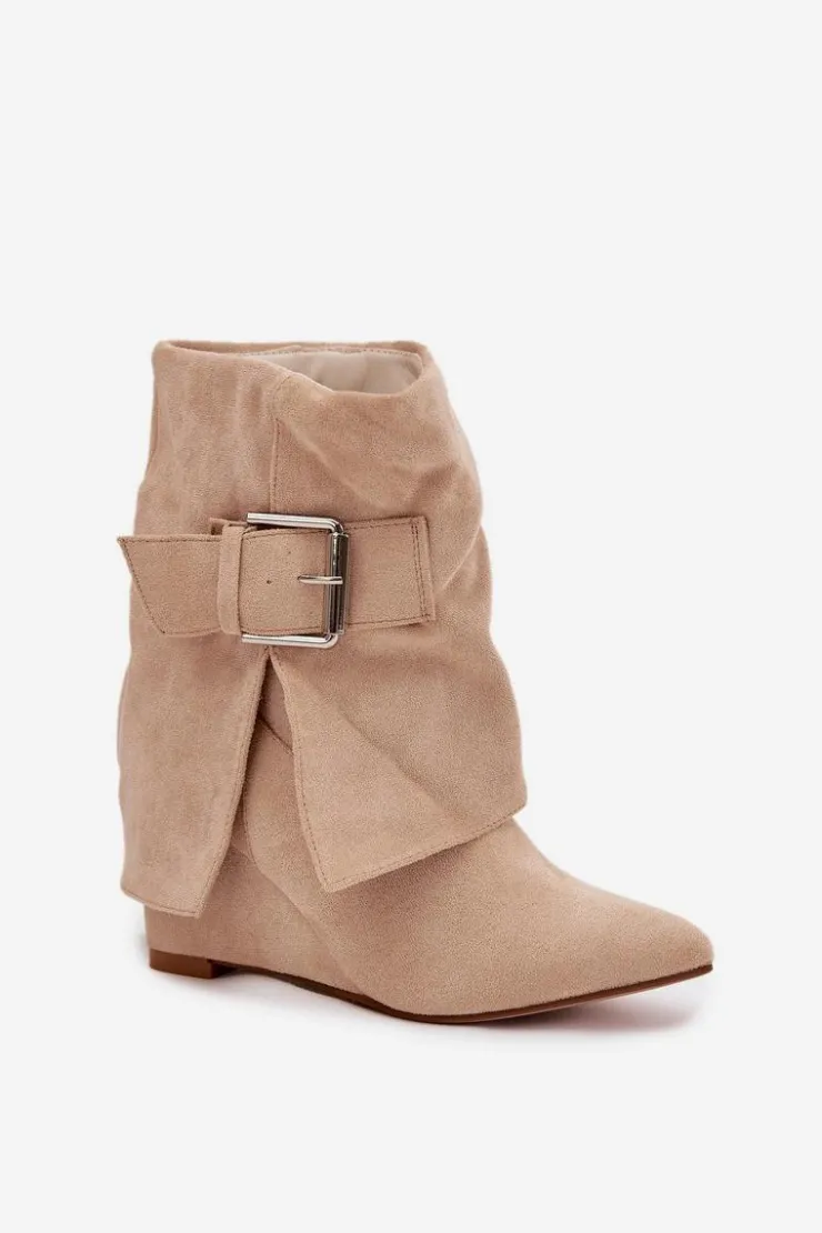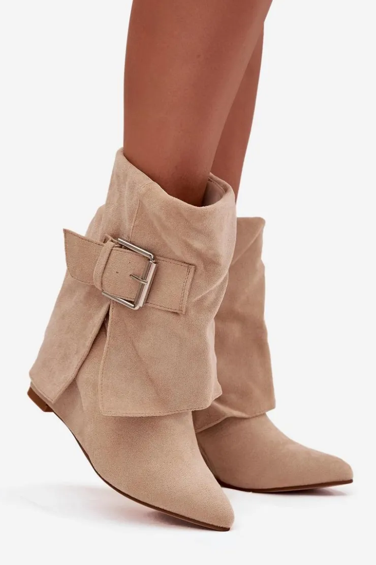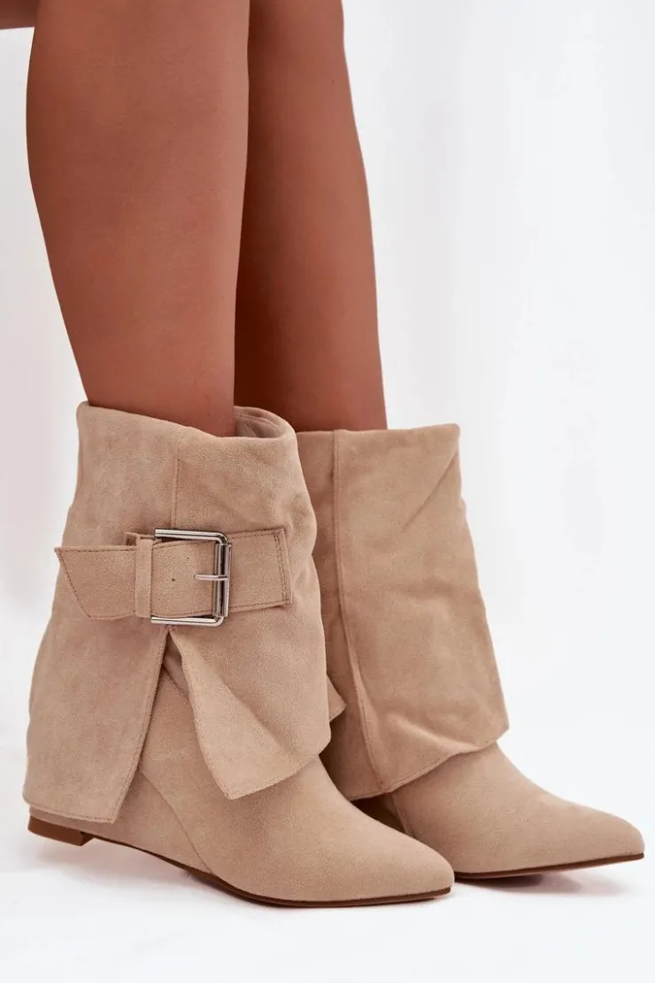 Botki z eko zamszu to oryginalny i stylowy wybór na co dzień i specjalne okazje. Model charakteryzuje się wywiniętą cholewką, która efektownie zachodzi na obcas koturn, nadając nowoczesny wygląd. Wsuwane botki z dodatkowym zapięciem na zamek zapewniają łatwość zakładania i idealne dopasowanie. Szpiczaste noski dodają elegancji, a duża klamra na cholewce stanowi wyrazisty akcent, który podkreśla unikatowy design. Te botki świetnie sprawdzą się w modnych, jesienno-zimowych stylizacjach, łącząc wygodę z wyrazistym stylem. Przy wyborze rozmiaru prosimy sugerować się tabelą rozmiarów.