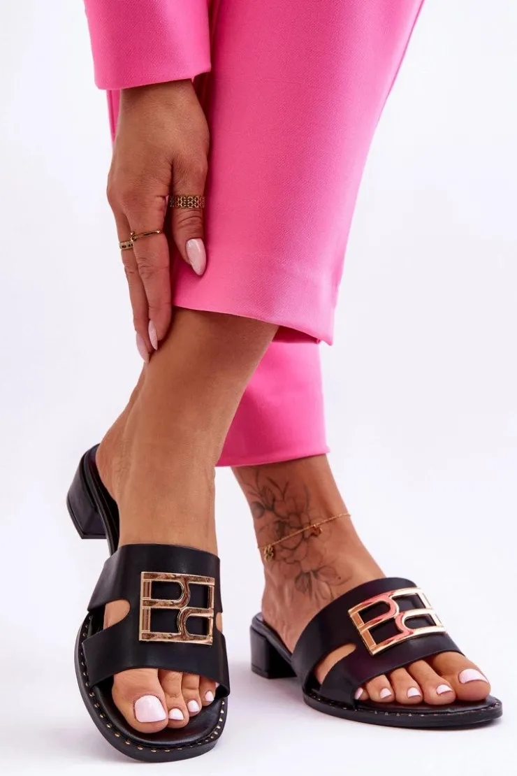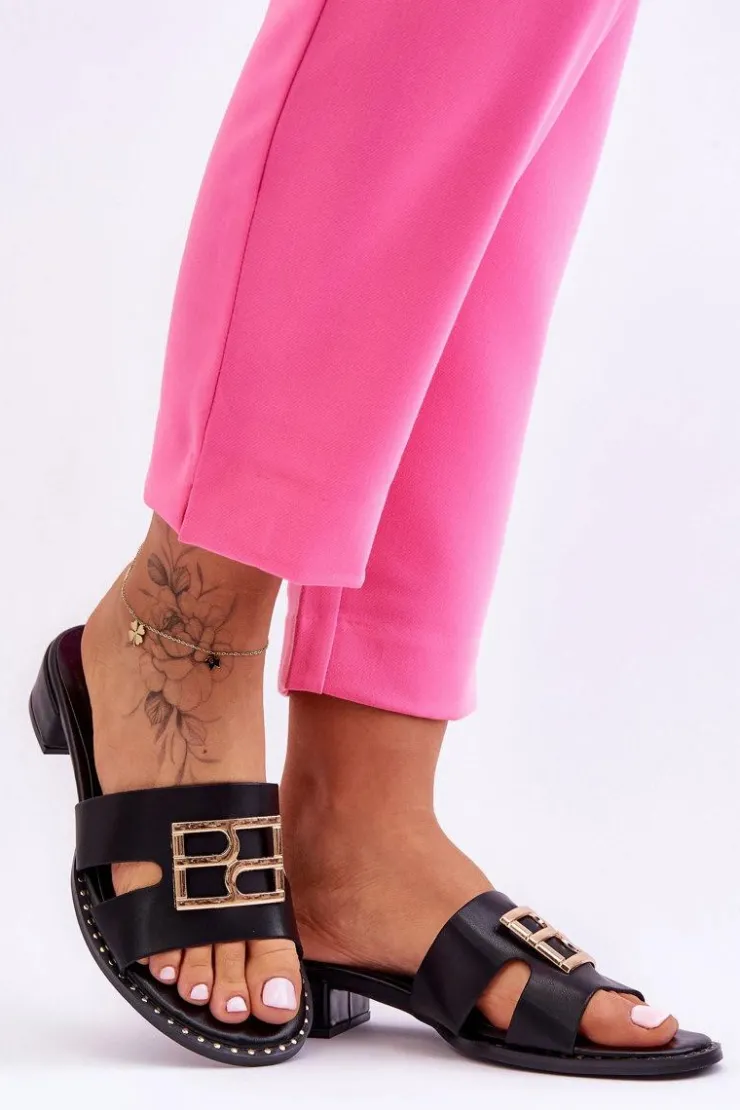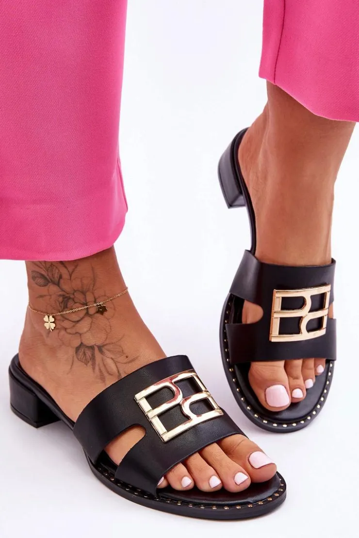 Eleganckie, damskie klapki zostały wykonane z eko skóry. Posiadają ozdobę na przodzie wykonaną z tworzywa sztucznego. Klapki osadzono na niskim obcasie. Wkładka jest niezwykle miękka i wygodna w użytkowaniu. Nosek jest odkryty i delikatnie zaokrąglony. Dodatkowo przy podeszwie klapki zostały ozdobione ćwiekami. Przy wyborze rozmiaru prosimy sugerować się tabelą rozmiarów.