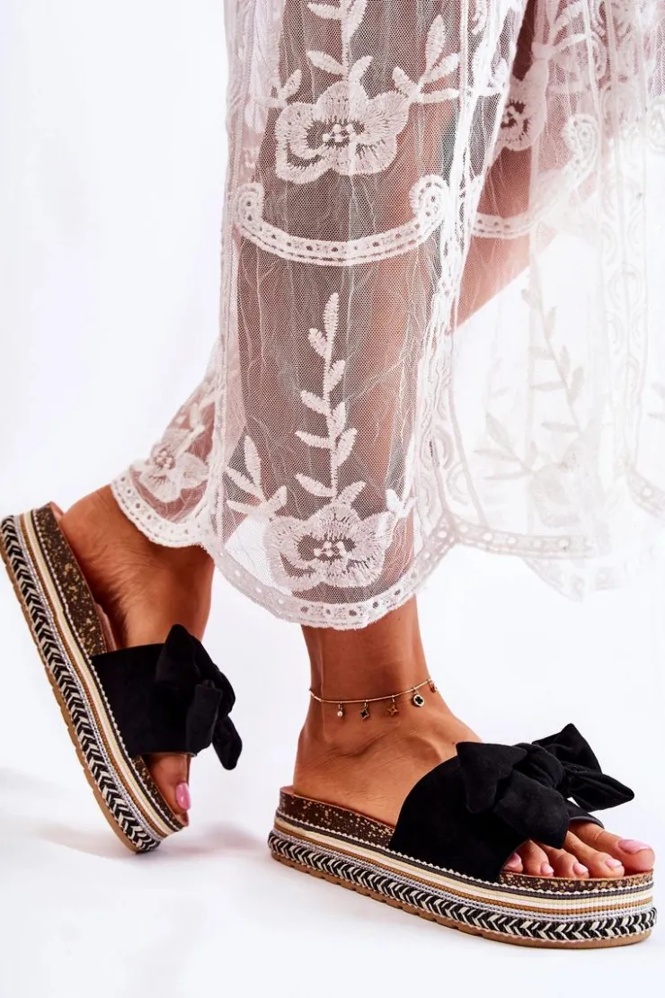 Klasyczne damskie klapki zostały osadzone na masywnej, korkowej platformie z wieloma zdobieniami. Wykonane z wierzchu z eko zamszu. Na przodzie znajduje się ozdoba w postaci kokardy. Profilowana wkładka jest wykonana z przyjemnego w dotyku eko zamszu. Podeszwa wykonana z tworzywa sztucznego. Model klasyczny, wsuwany. Te klapki to idealny model na lato! Przy wyborze rozmiaru prosimy sugerować się tabelą rozmiarów.