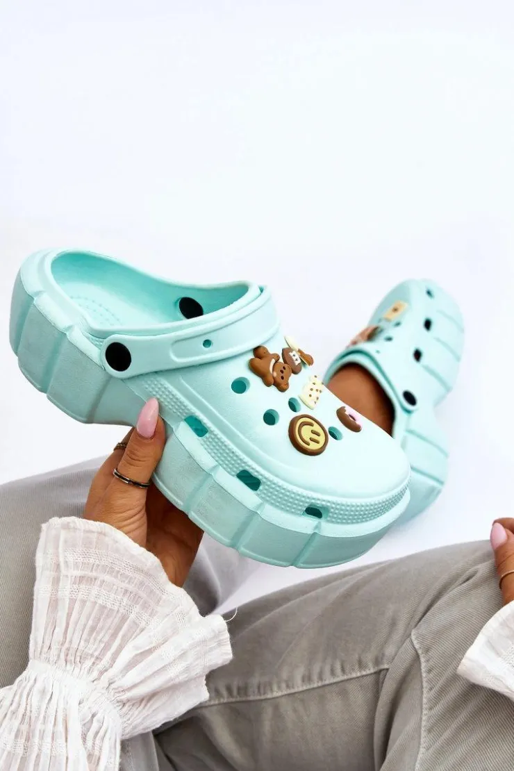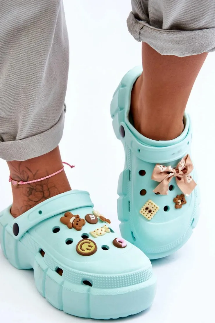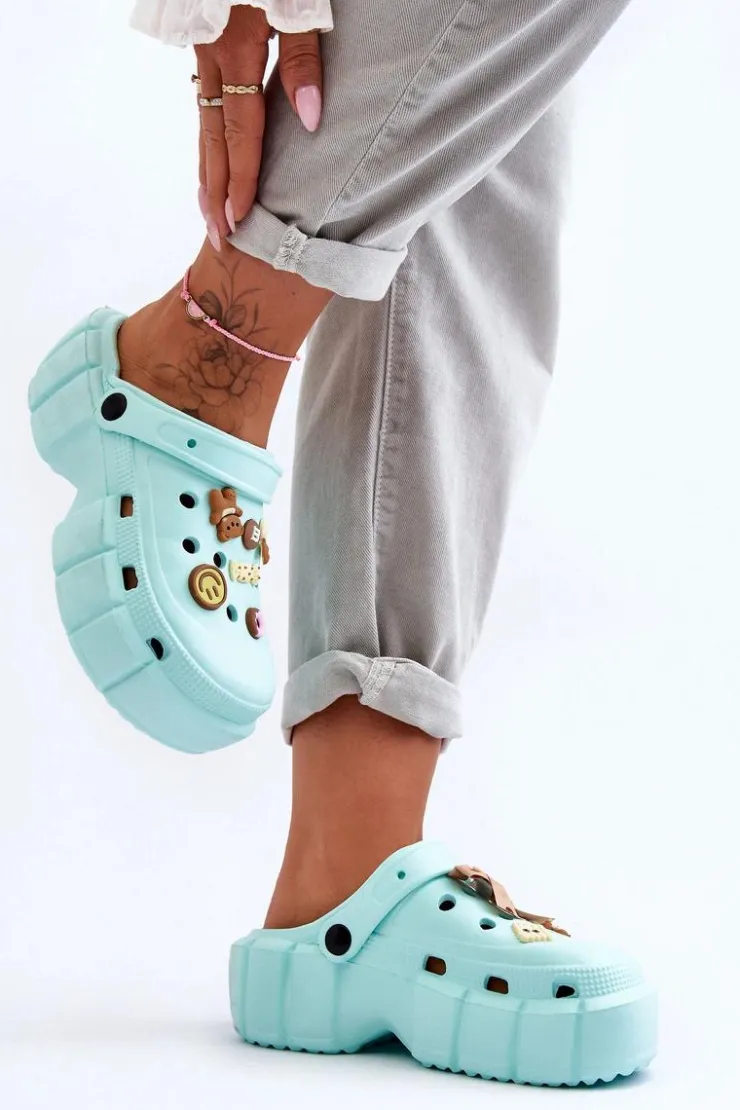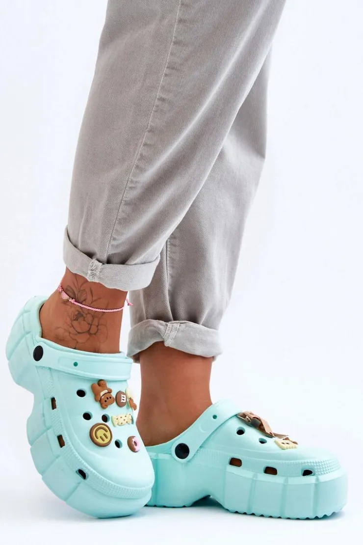 Damskie kroksy z uroczymi elementami zdobiącymi cholewkę powinny być Twoje! Zostały wykonane z lekkiego, piankowego tworzywa. Wkładka posiada delikatne wypustki. Ruchomy paseczek zabezpiecza przed przesuwaniem się stopy. Buty zostały osadzone na masywnym, płaskim obcasie oraz platformie. Otwory w cholewce pozwalają na odpowiednią wentylację obuwia. Przy wyborze rozmiaru prosimy sugerować się tabelą rozmiarów.
