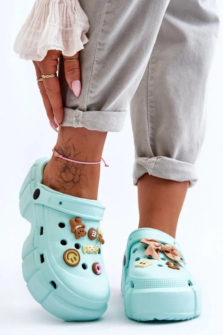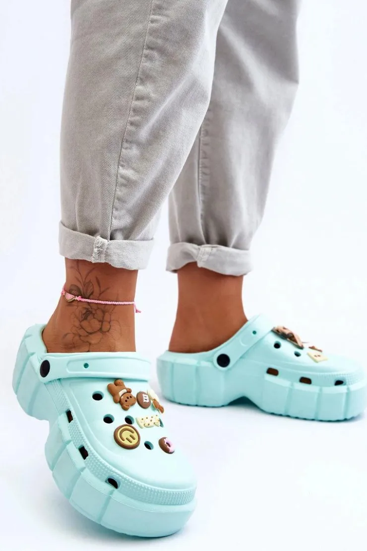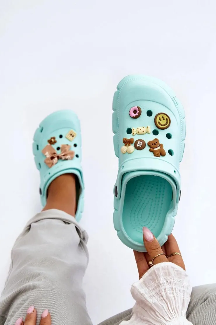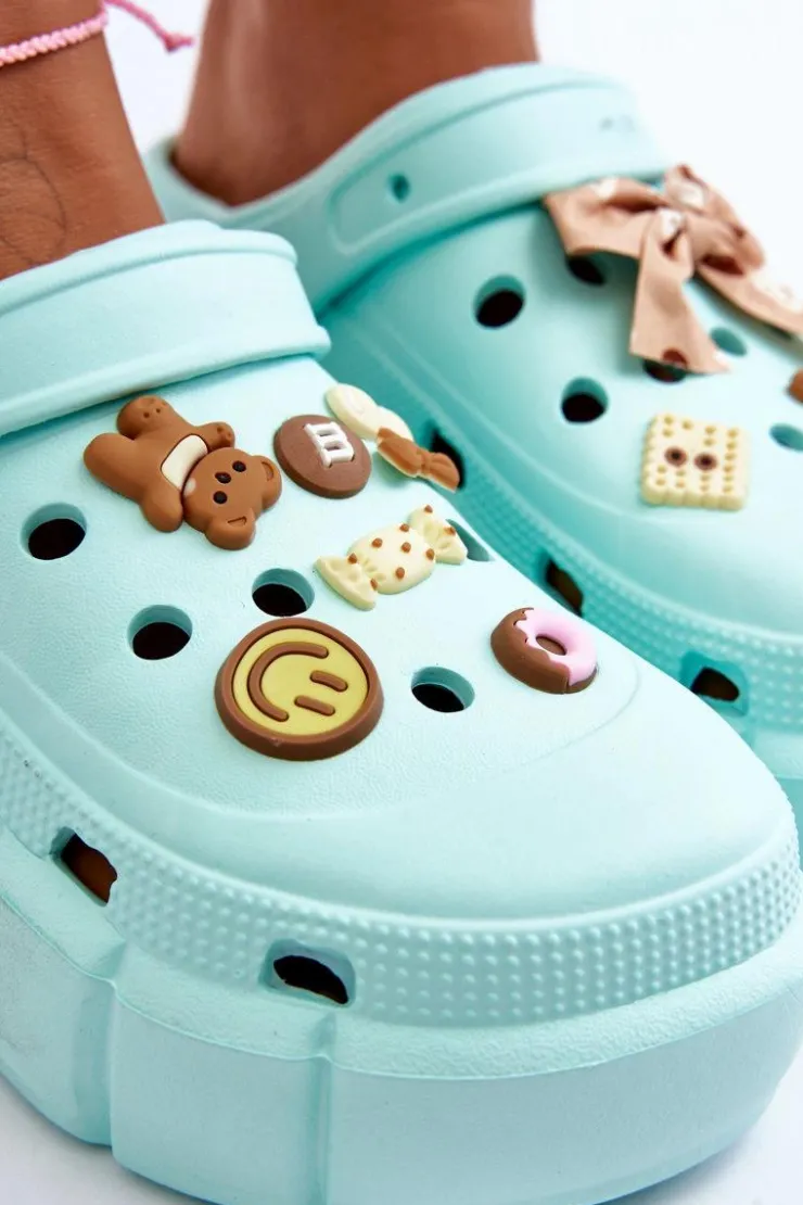 Damskie kroksy z uroczymi elementami zdobiącymi cholewkę powinny być Twoje! Zostały wykonane z lekkiego, piankowego tworzywa. Wkładka posiada delikatne wypustki. Ruchomy paseczek zabezpiecza przed przesuwaniem się stopy. Buty zostały osadzone na masywnym, płaskim obcasie oraz platformie. Otwory w cholewce pozwalają na odpowiednią wentylację obuwia. Przy wyborze rozmiaru prosimy sugerować się tabelą rozmiarów.