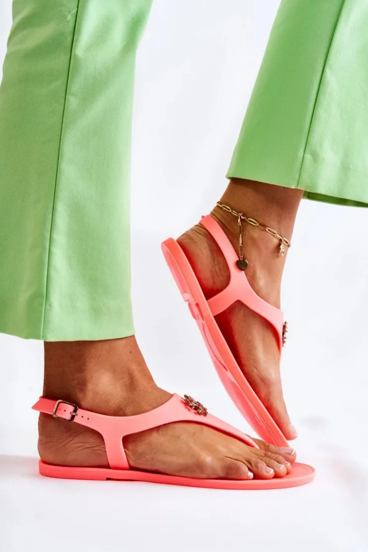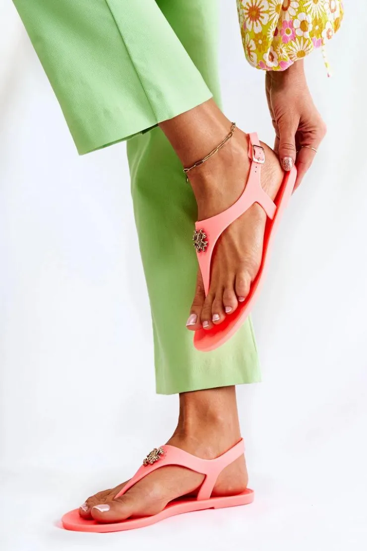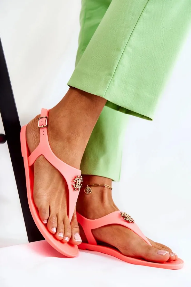 Gumowe sandałki są idealnym obuwiem na letnie dni! Niezwykle przewiewny model. Sandałki w formie japonek z odkrytym, zaokrąglonym noskiem. Zapinane wokół kostki na regulowany pasek ze sprzączką. Osadzone na niskim, płaskim obcasie. Na środkowym pasku znajduje się ozdobny emblemat. Model, który powinnaś mieć w swojej szafie! Przy wyborze rozmiaru, prosimy sugerować się tabelą rozmiarów.