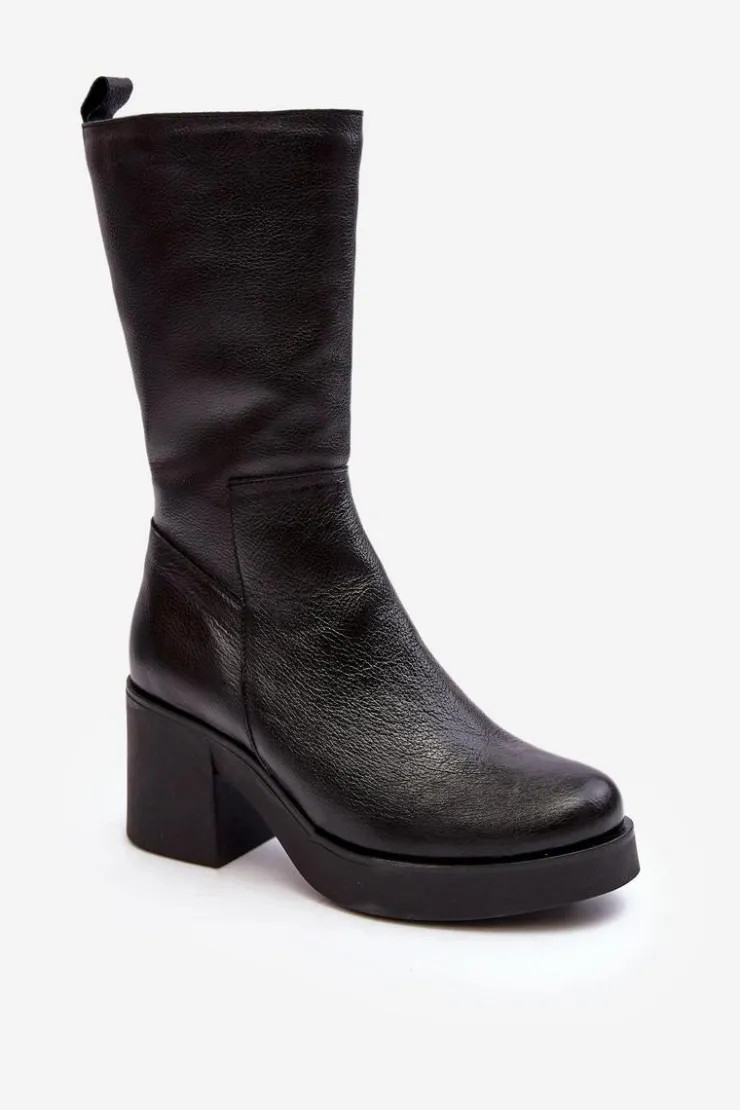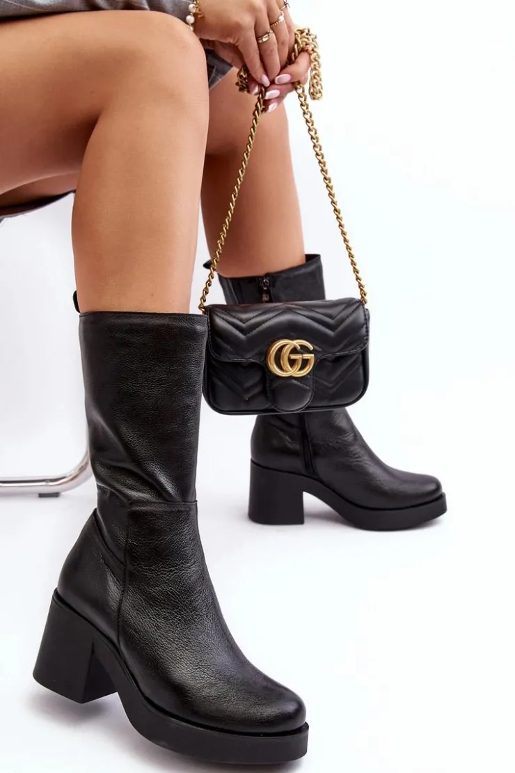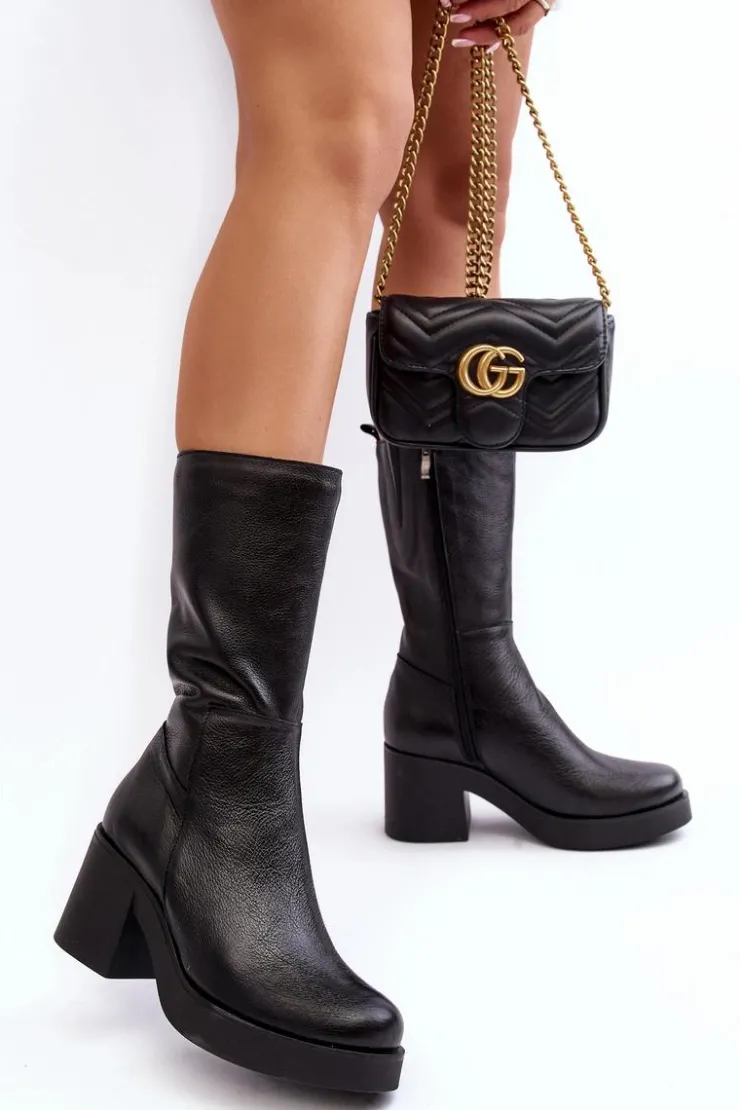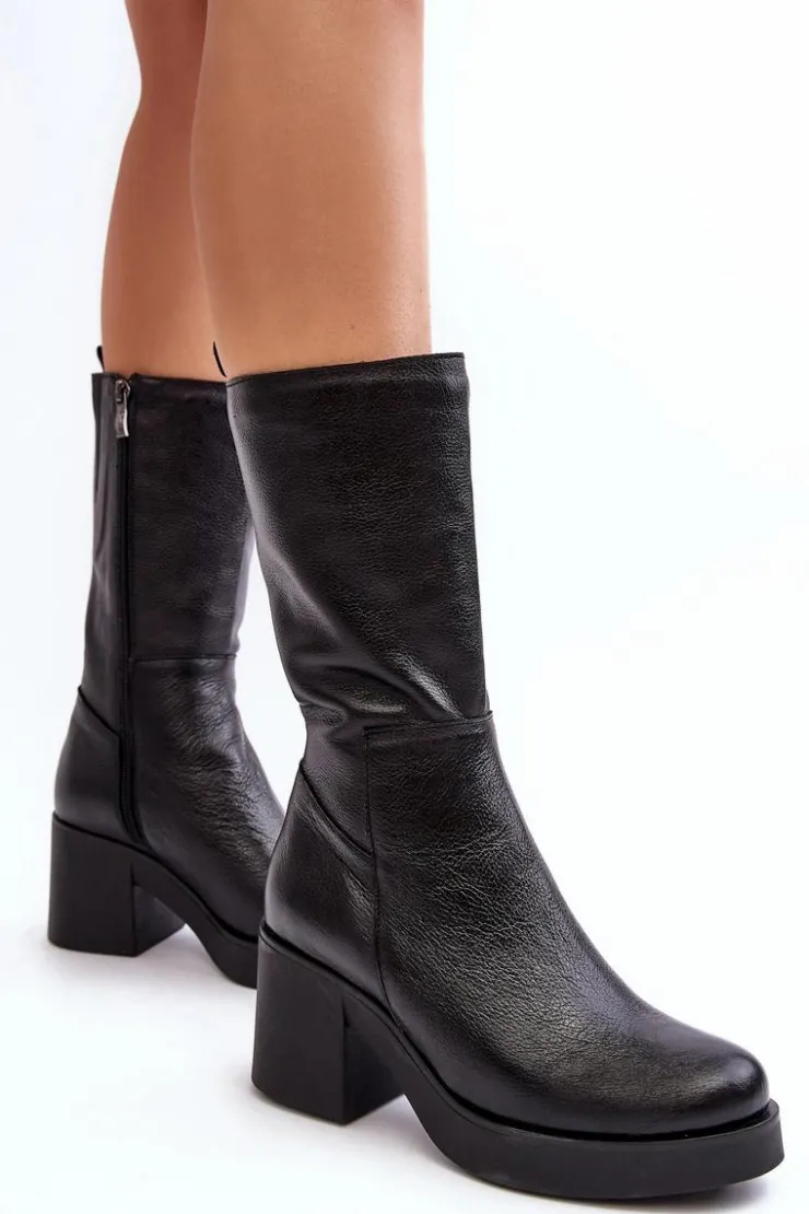 Kozaki damskie z cholewką do połowy łydki. Wykonane z wysokiej jakości naturalnej skóry. Model ten został ocieplony kocem obuwniczym. Zapinane na całej długości suwakiem. Kozaki posiadają obcas w postaci masywnego słupka oraz platformę z antypoślizgową podeszwą. Świetny model na chłodne dni! Przy wyborze rozmiaru prosimy kierować tabelą rozmiarów.