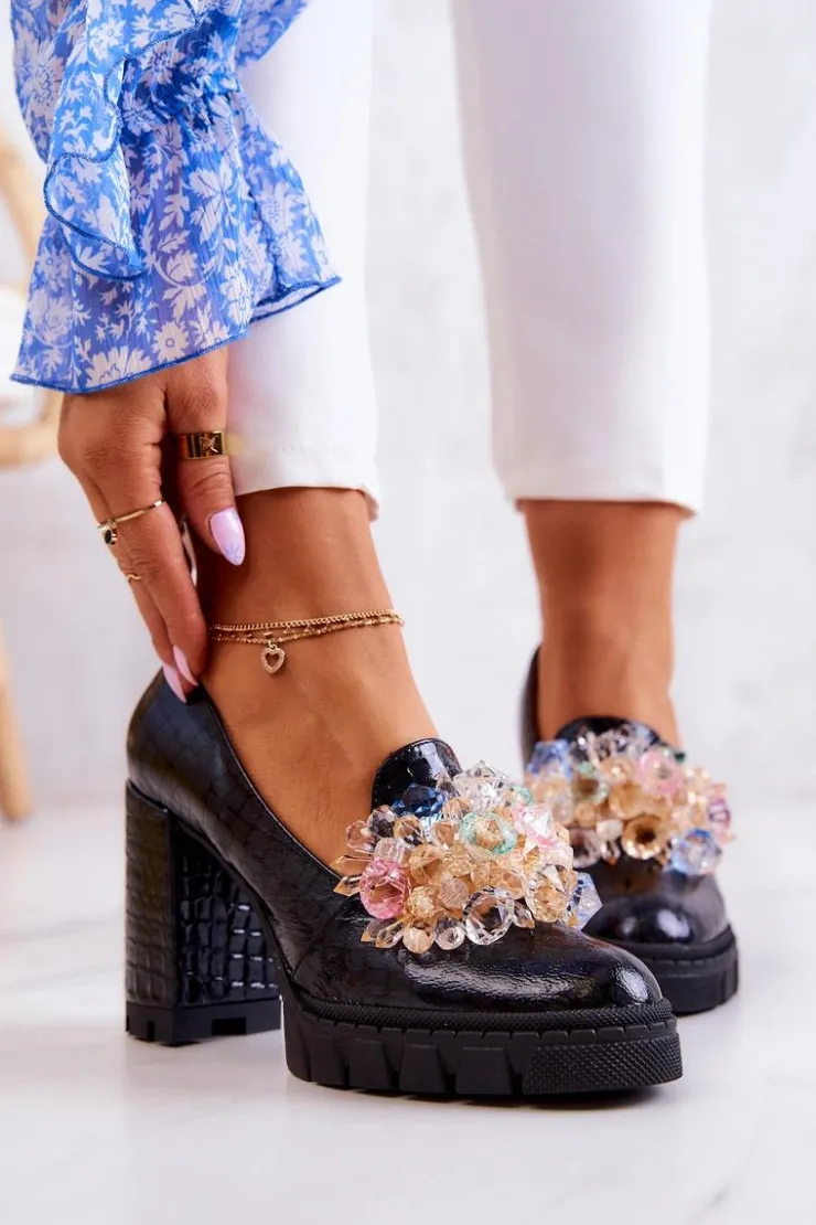 Cudne czółenka na masywnym obcasie w postaci słupka oraz platformie. Traperowa podeszwa sprawia, że te buty są wygodne i stabilne podczas użytkowania. Posiadają ozdobę w postaci imitacji barwnych kryształków z przodu obuwia. Miękka wkładka została wykonana z naturalnej skóry. Komfort to podstawa! Modny fason zachwyci niejedną miłośniczkę wysokich obcasów! Koniecznie powinnaś mieć ten model w swojej kolekcji obuwia! Przy wyborze rozmiaru prosimy sugerować się tabelą rozmiarów.