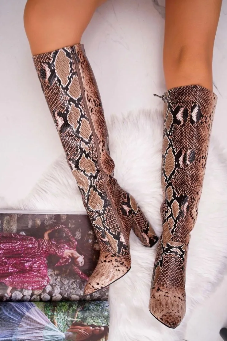 Online Boto Kozaki Damskie Na Słupku Zwierzęca Faktura Brązowe Brouny