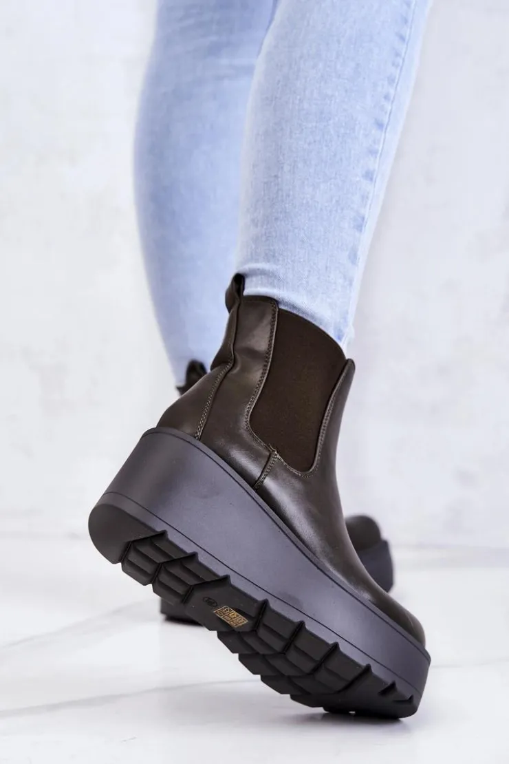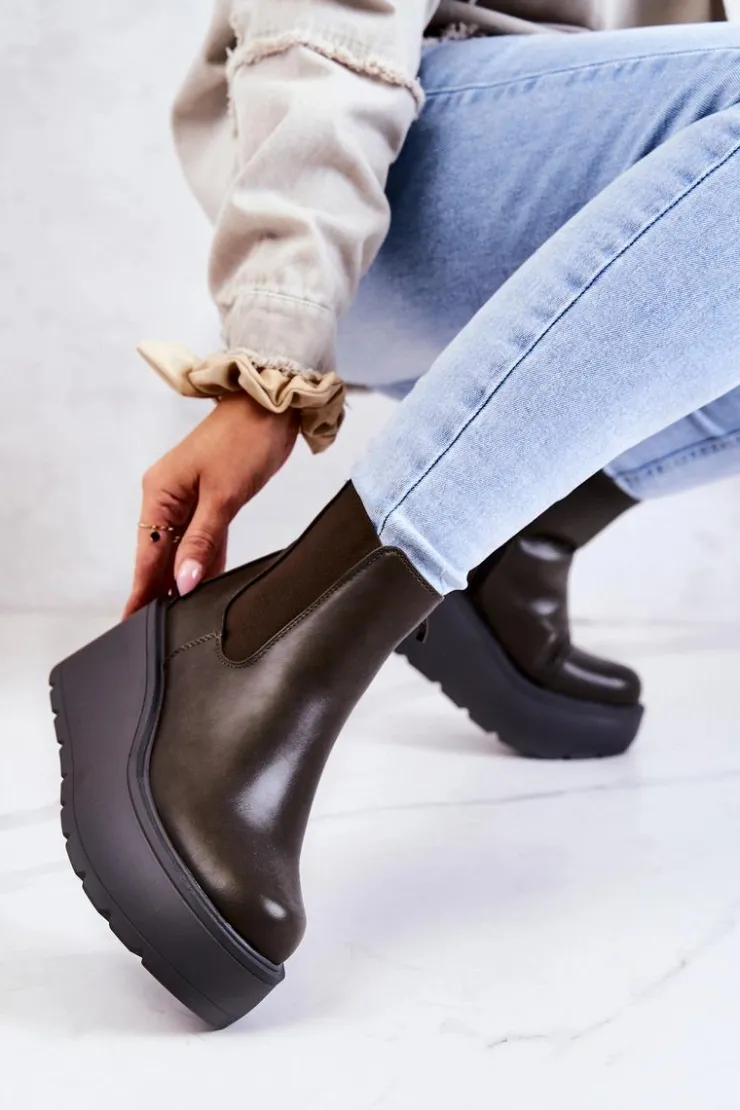 Botki damskie wykonane z eko skóry. Wnętrze botków ocieplone jest miłym w dotyku kocem obuwniczym. Wysoka platforma. Przy wyborze rozmiaru prosimy sugerować się tabelą rozmiarów.