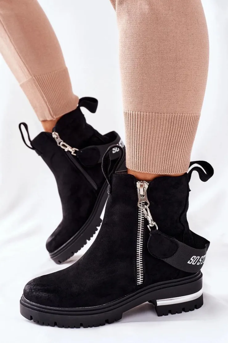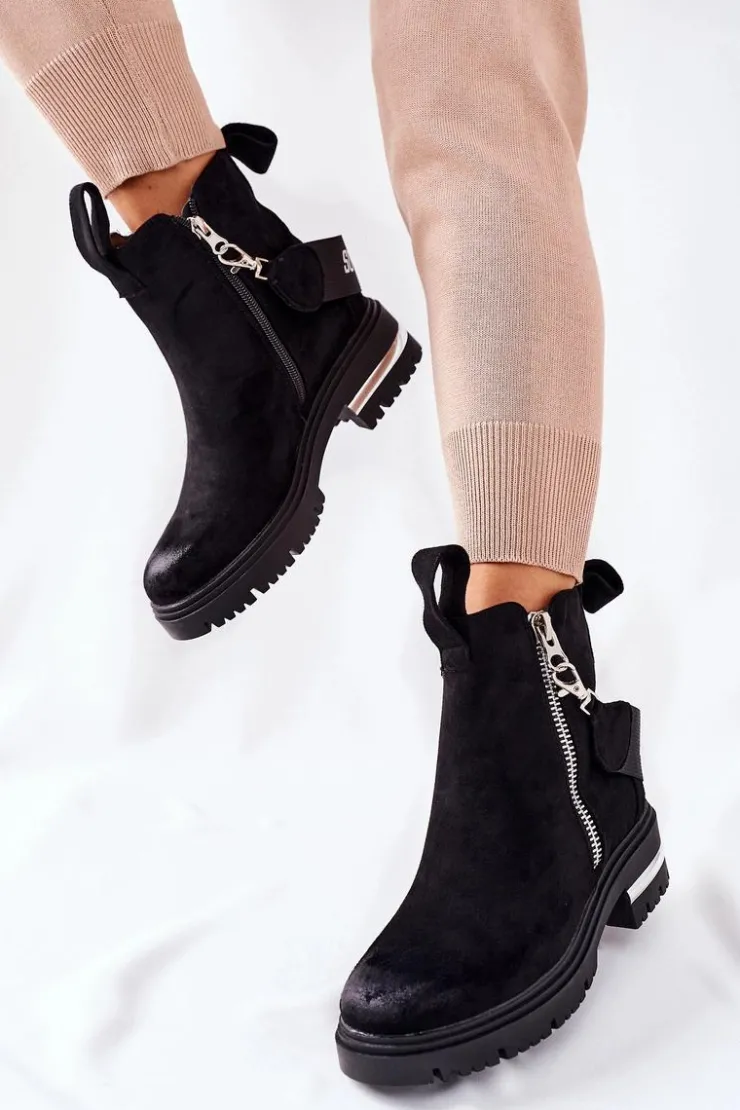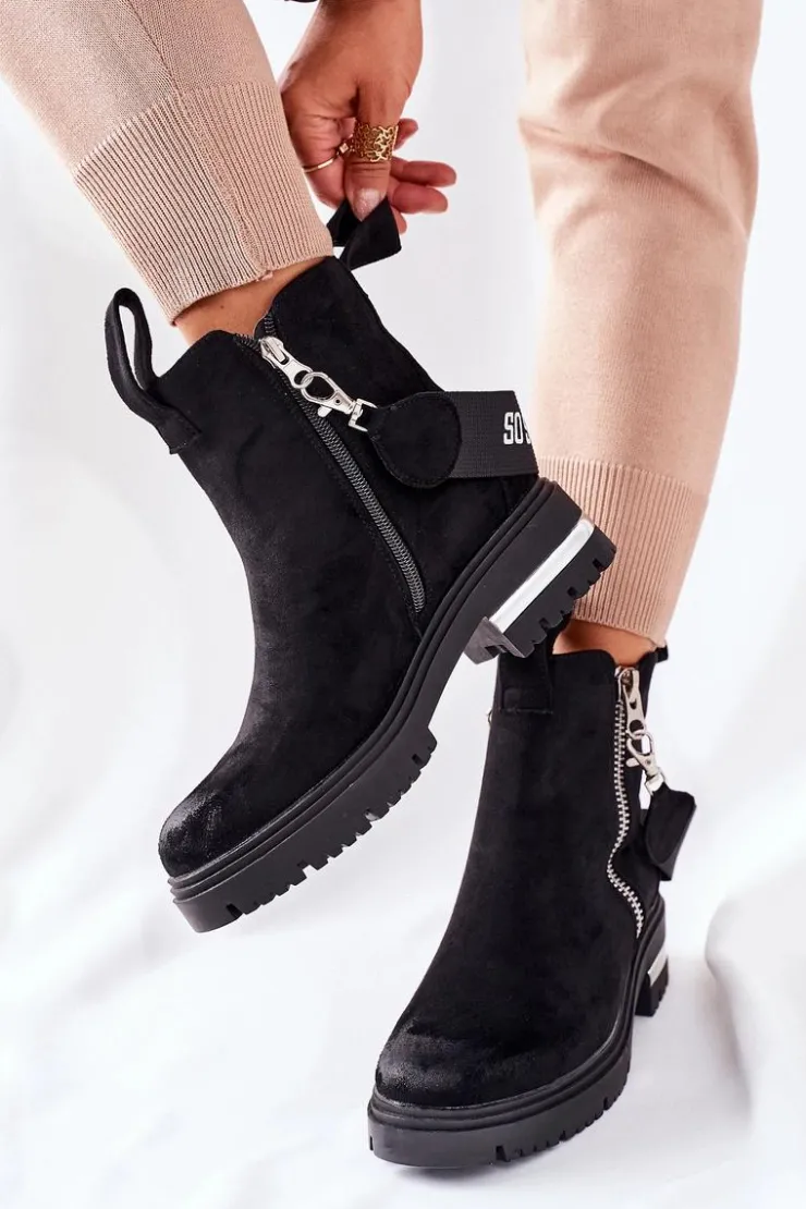 Botki damskie wykonane z eko zamszu. Wnętrze ocieplone jest miłym w dotyku kocem obuwniczym. Przy wyborze rozmiaru prosimy sugerować się tabelą rozmiarów.