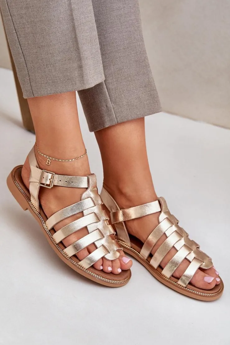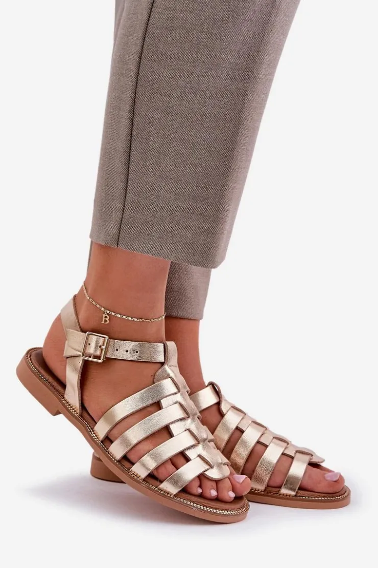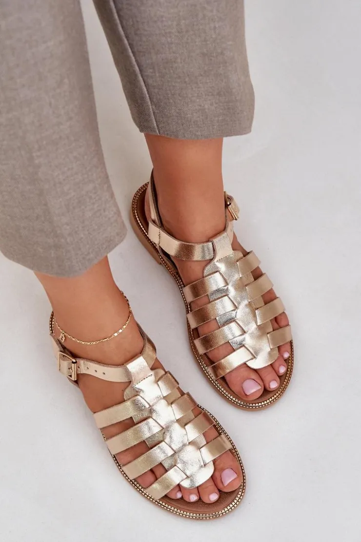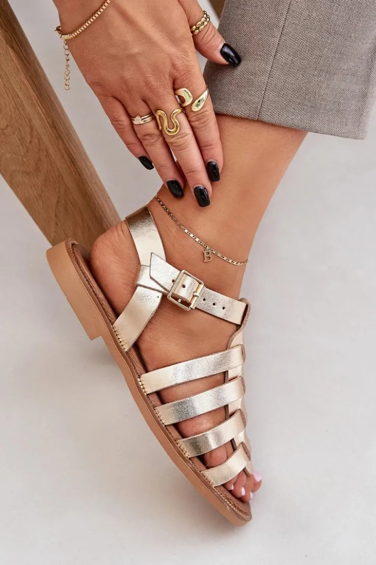 Online Boto Skórzane Sandały Na Płaskim Obcasie Zazoo 3686 Złote Złoty