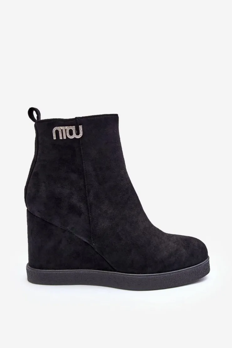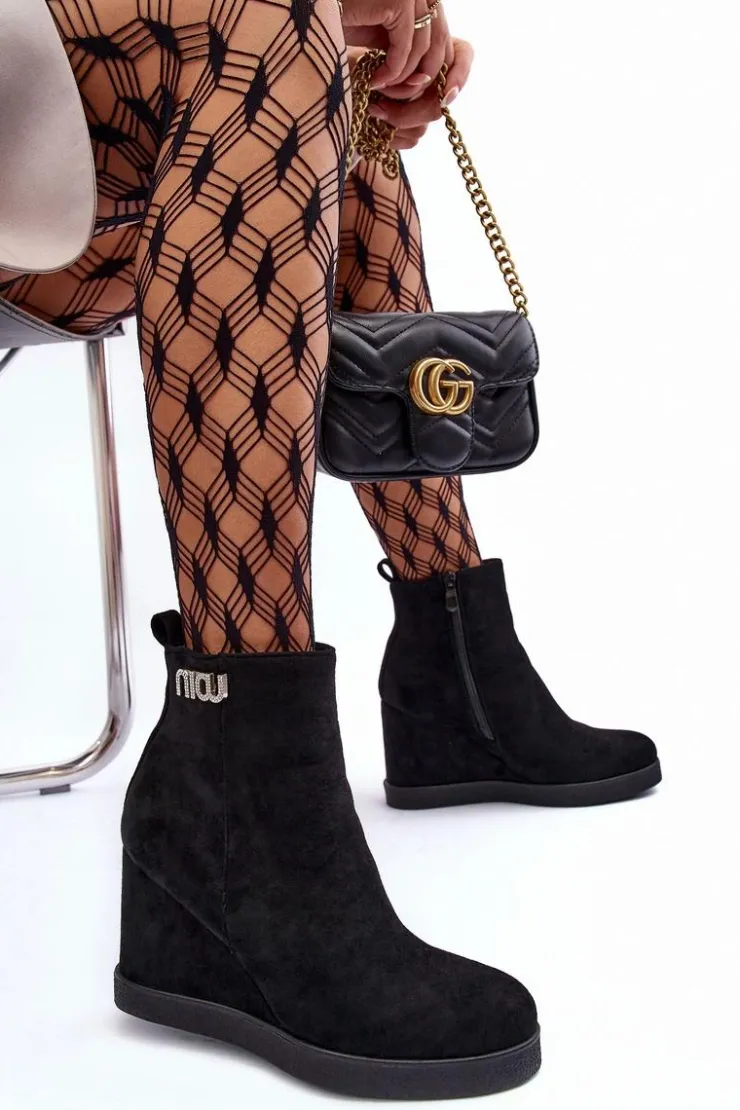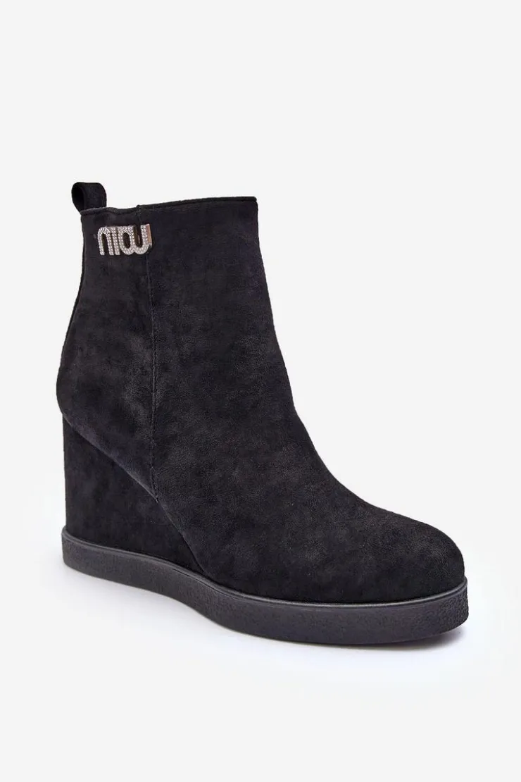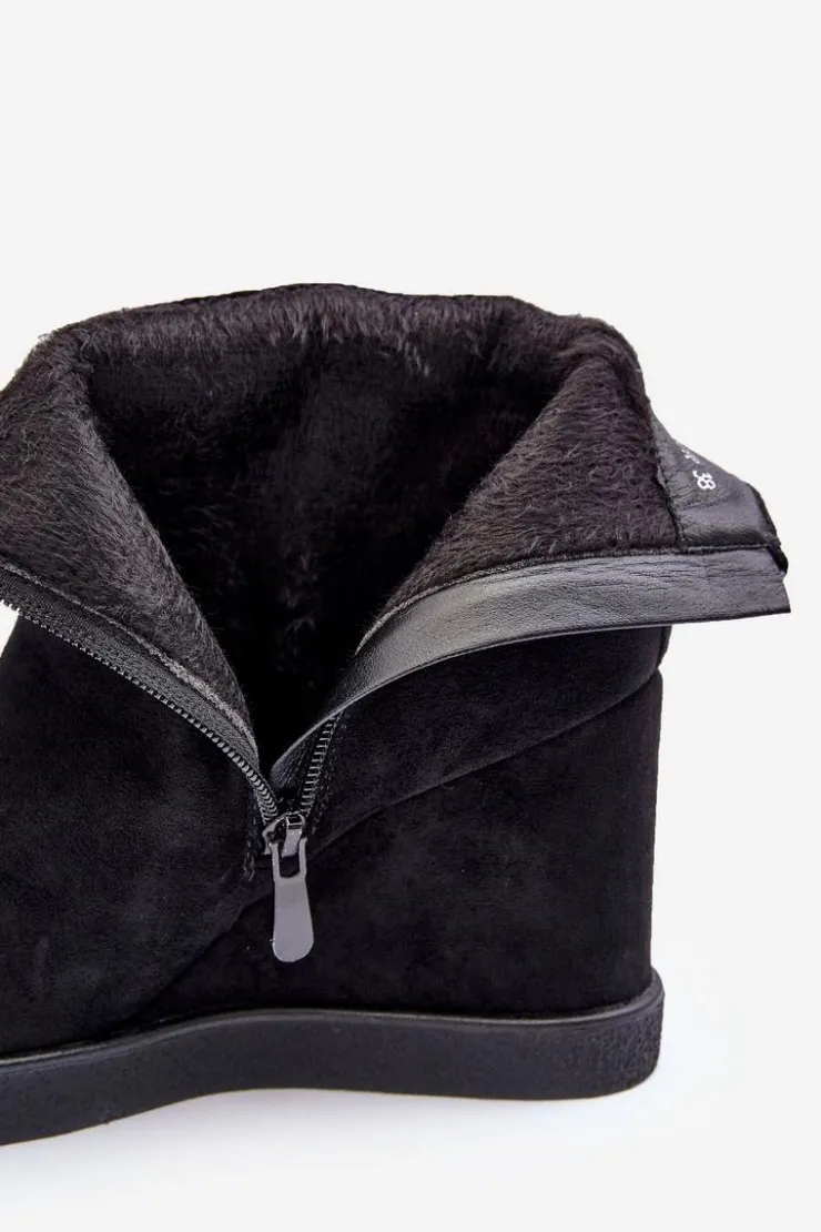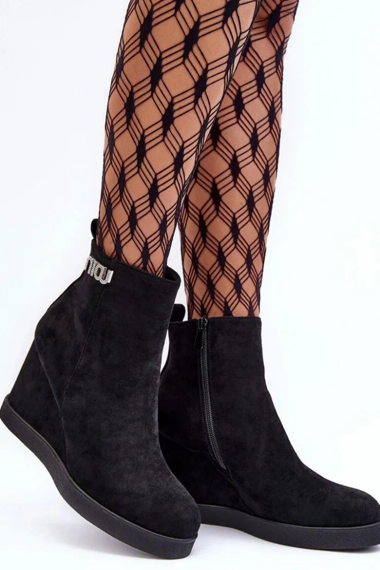 Botki z cholewką za kostkę zapinane na suwak po wewnętrznej stronie. Osadzone na koturnie oraz platformie. Wykonane z eko zamszu. Zapiętek usztywniony, noski zaokrąglone. Na górze cholewki mała ozdoba. Wnętrze ocieplone kocem obuwniczym. Przy wyborze rozmiaru prosimy sugerować się tabelą rozmiarów.