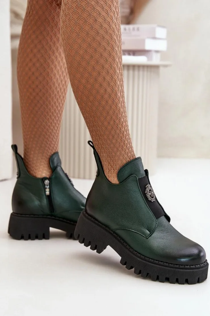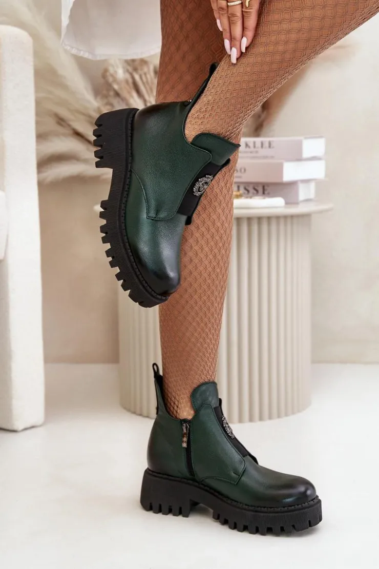 Damskie botki zostały wykonane z wysokiej jakości naturalnej skóry. Osadzone na masywnym obcasie i platformie ze żłobieniami. Model zapinany na suwak po wewnętrznej stronie cholewki. Z przodu na elastycznej wstawce znajduje się ozdoba z tworzywa sztucznego. Wnętrze ocieplone kocem obuwniczym. Ten wyjątkowy model wzbogaci wiele Twoich stylizacji! Przy wyborze rozmiaru prosimy sugerować się tabelą rozmiarów.