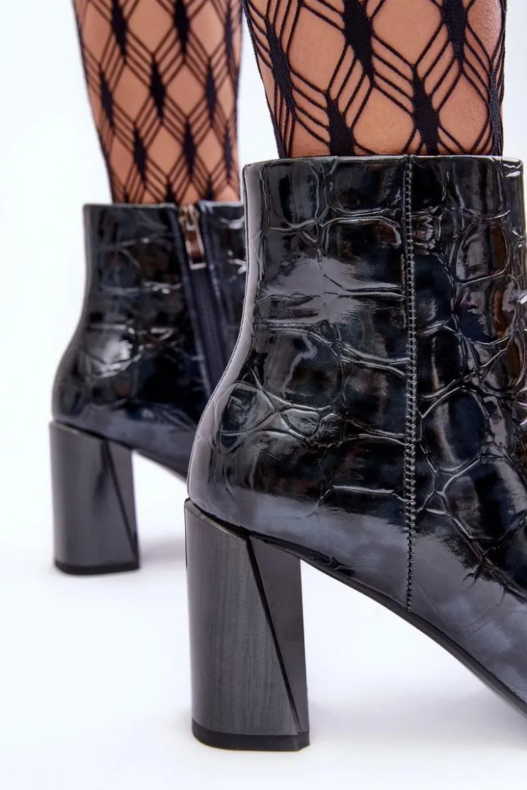 Botki osadzone na obcasie w postaci słupka. Wykonane z eko skóry. Zapinane na suwak z boku cholewki. Noski w szpic. Środek ocieplony kocem obuwniczym. Dodatkowo zapiętek jest usztywniony. Przy wyborze rozmiaru prosimy sugerować się tabelą rozmiarów.