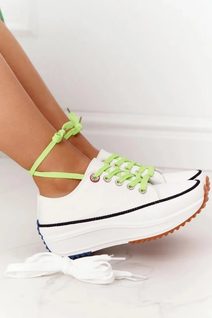 Wyjątkowe trampki na platformie. Buty dobrze dopasowują się do kształtu stopy, posiadają profilowaną wkładkę z eko skóry oraz antypoślizgową podeszwę. Koniecznie sprawdź całą naszą kolekcję trampek! Trampki posiadają dwie pary sznurówek – zielone oraz białe. Przy wyborze rozmiaru prosimy sugerować się tabelą rozmiarów.