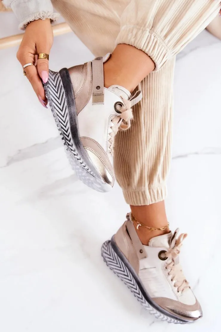 Niewątpliwie fasony tej marki wyróżniają się na tle innych butów! Cudowne połączenia kolorystyczne oraz materiałowe. Sneakersy, którymi podkreślisz wiele stylizacji. Posiadają koturn, platformę oraz sztywny zapiętek stabilizujący nogę. Wykonane z naturalnej skóry oraz materiału. Miękka wyściółka ze skóry daje duże poczucie komfortu. Ciekawe wiązanie oraz przecięcia materiału na bokach tworzą oryginalny design!Przy wyborze rozmiaru prosimy sugerować się tabelą rozmiarów.