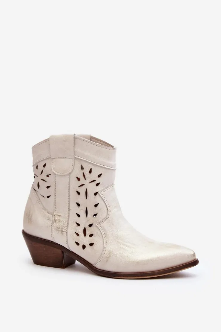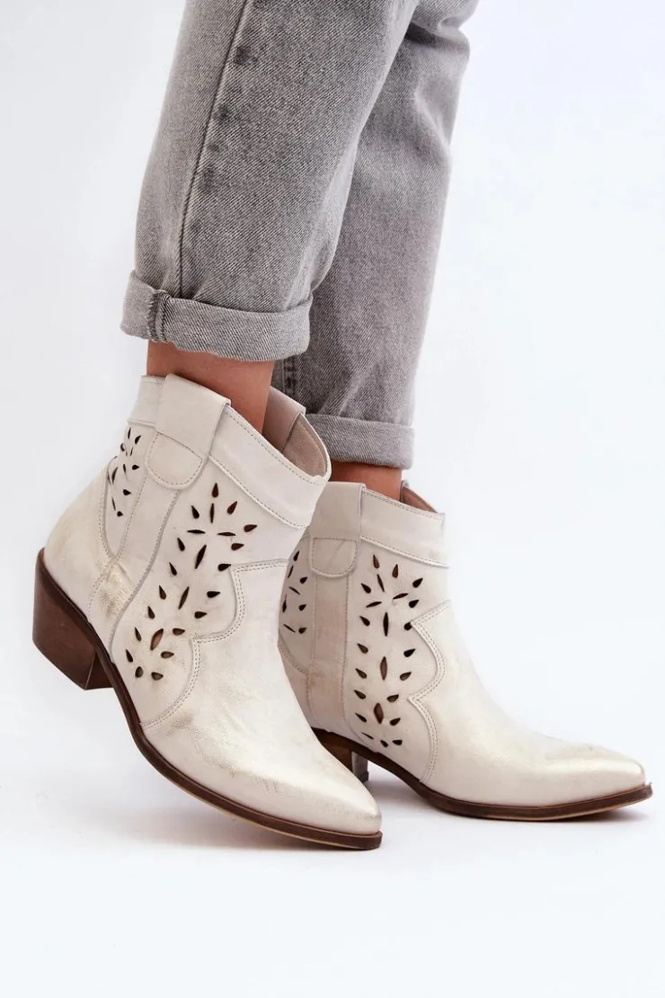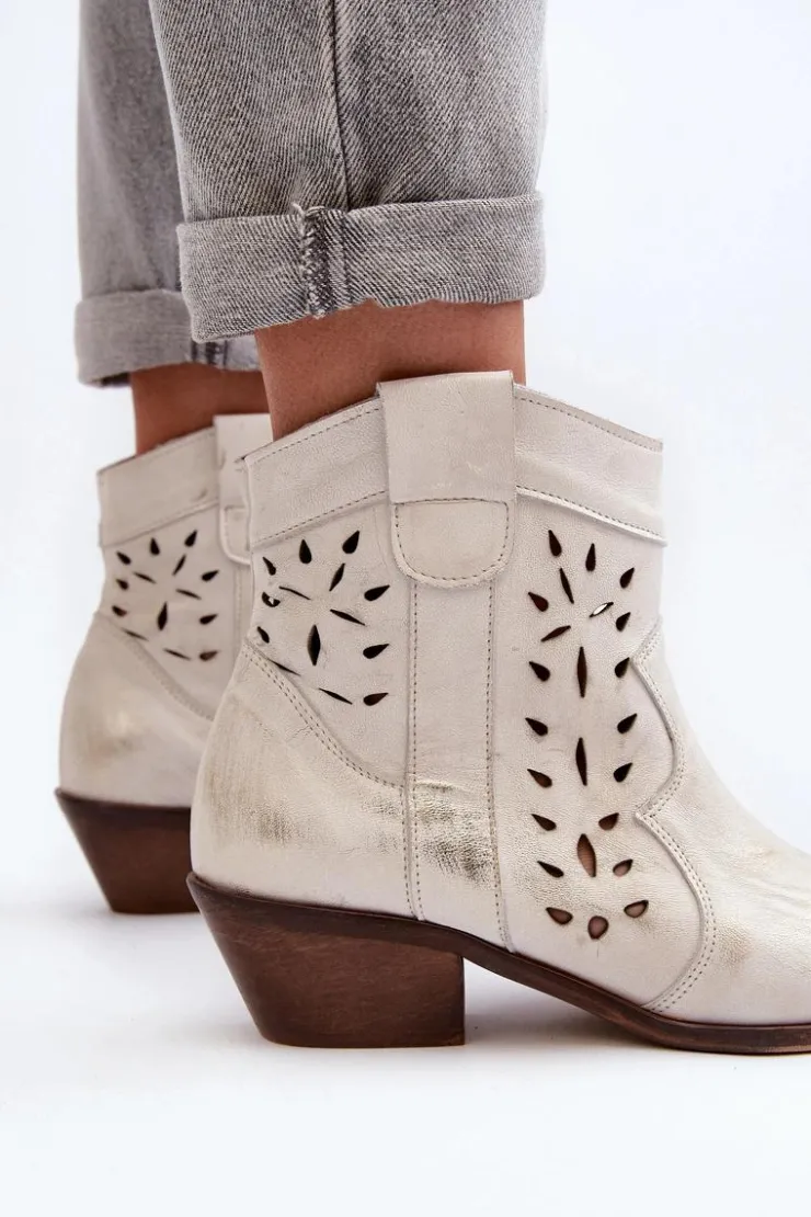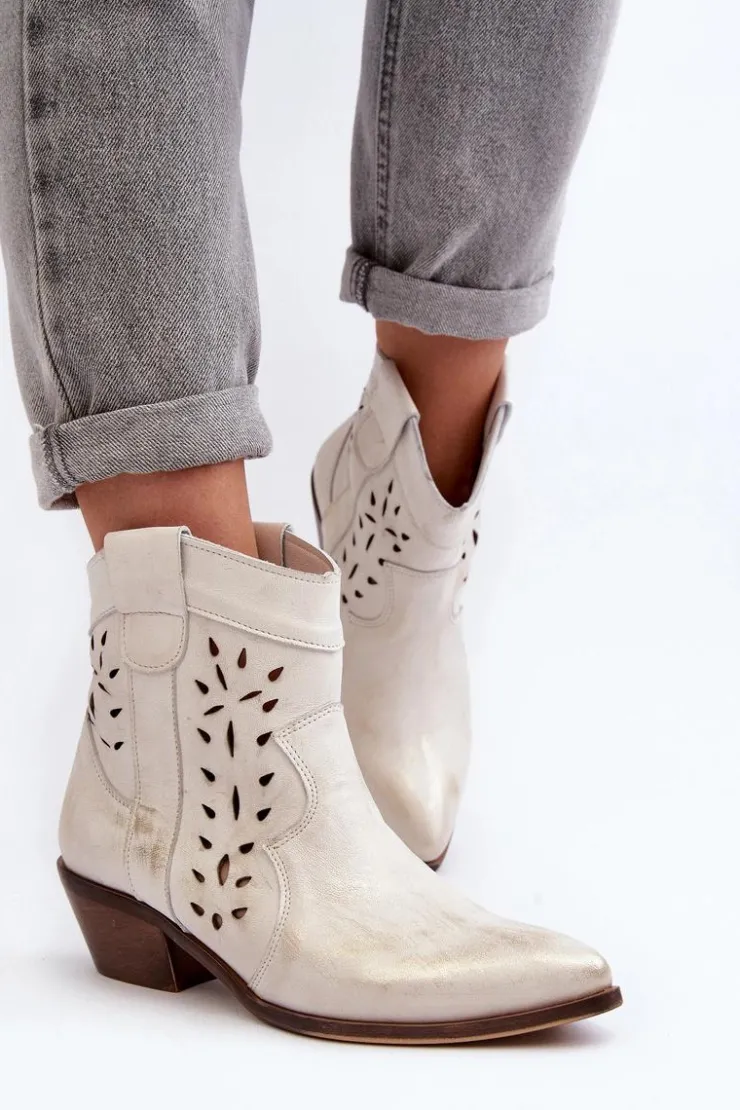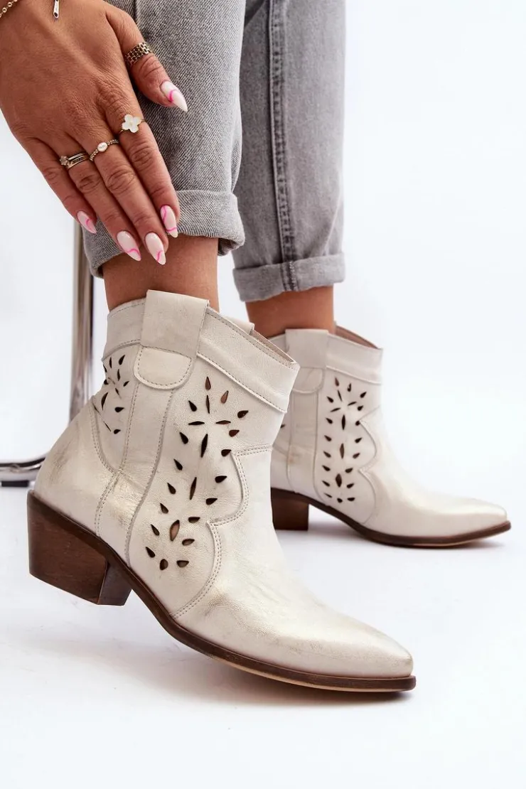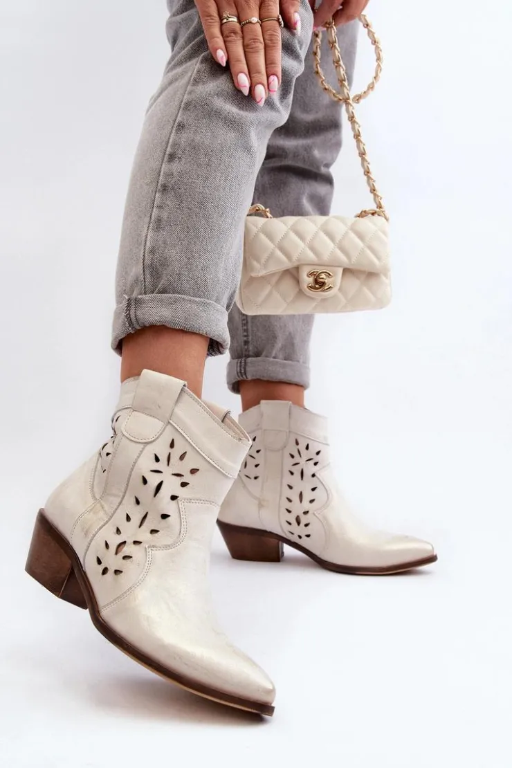 Damskie botki w stylu kowbojek zostały wykonane ze skóry naturalnej. Osadzone na niskim obcasie, który gwarantuje stabilność na każdym kroku. Noski w szpic optycznie wysmuklą nogi. Model wsuwany. Cholewka za kostkę. Przy wyborze rozmiaru prosimy sugerować się tabelą rozmiarów.