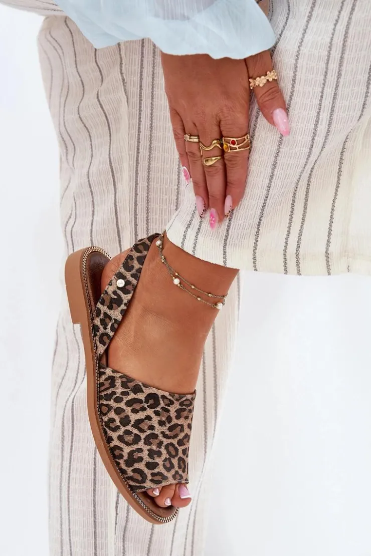 Wsuwane sandałki damskie zostały wykonane z wysokiej jakości naturalnej skóry. Osadzone na płaskim obcasie ze zdobieniami przy podeszwie. Sandałki posiadają odkrytą piętę i palce. Miękka, skórzana wkładka zapewni wygodne użytkowanie. Sandałki są wsuwane, a ich tylna część cholewki jest delikatnie usztywniona. Przy wyborze rozmiaru prosimy kierować się tabelą rozmiarów.