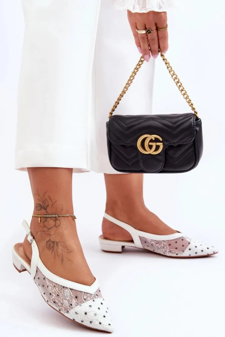 Eleganckie baleriny z odkrytą piętą i noskiem w szpic na pewno przypadną Ci do gustu! Zostały wykonane z połączenia tworzywa i eko skóry. Posiadają zapinanie na regulowany pasek ze sprzączką. Miękka, eko skórzana wkładka zapewni komfort podczas użytkowania. Baleriny posiadają płaski obcas, co sprawia, że będziesz czuć się w nich stabilnie.Podczas wyboru rozmiaru prosimy sugerować się tabelą rozmiarów.