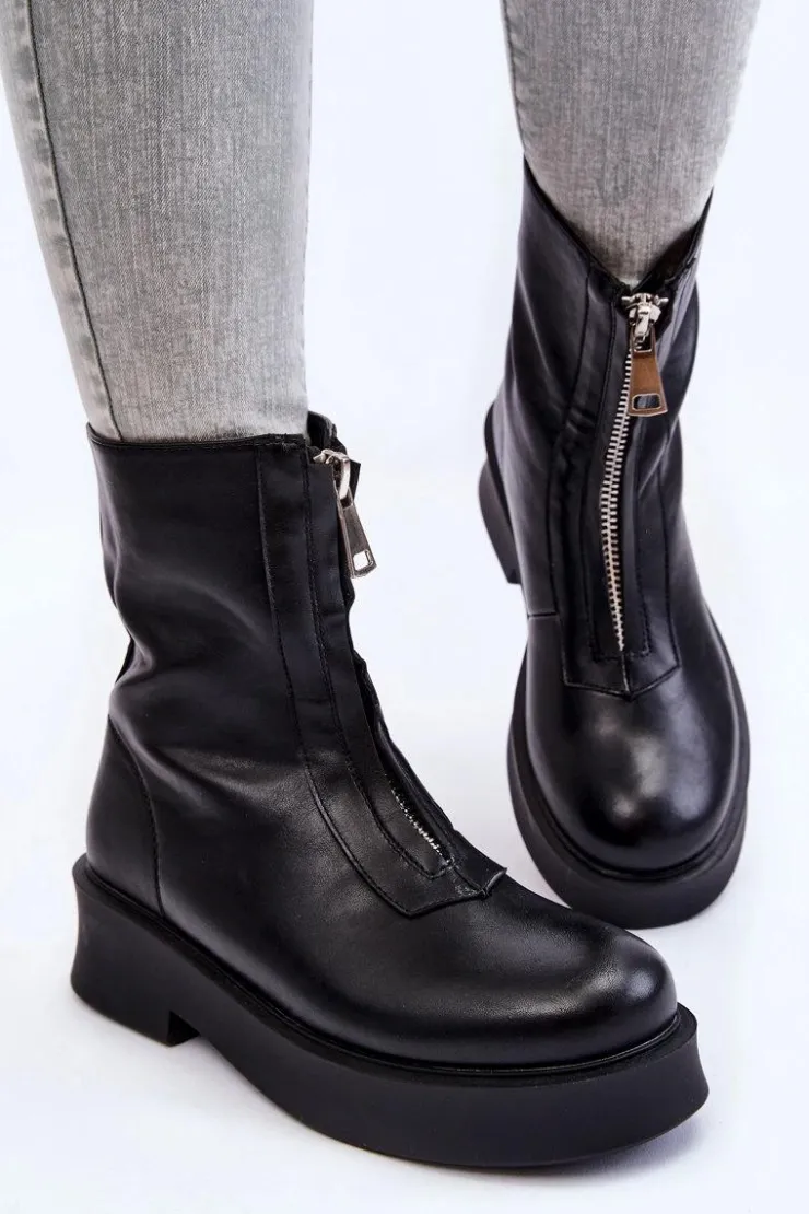 Klasyczne, damskie botki zostały wykonane z eko skóry. Posiadają usztywniany zapiętek. Osadzone na płaskim obcasie i masywnej platformie. Zapinane z przodu na suwak. Model za kostkę świetnie sprawdzi się w wielu stylizacjach. Wyściółka materiałowa. Koniecznie powinnaś mieć ten model w swojej szafie! Przy wyborze rozmiaru prosimy sugerować się tabelą rozmiarów.