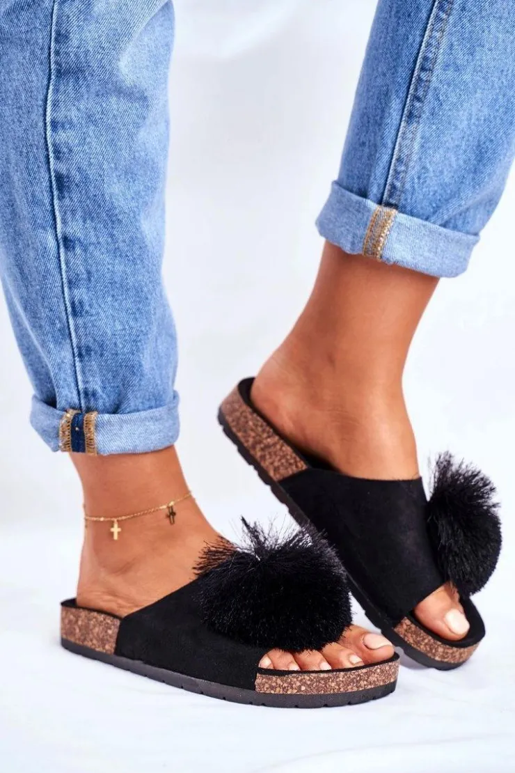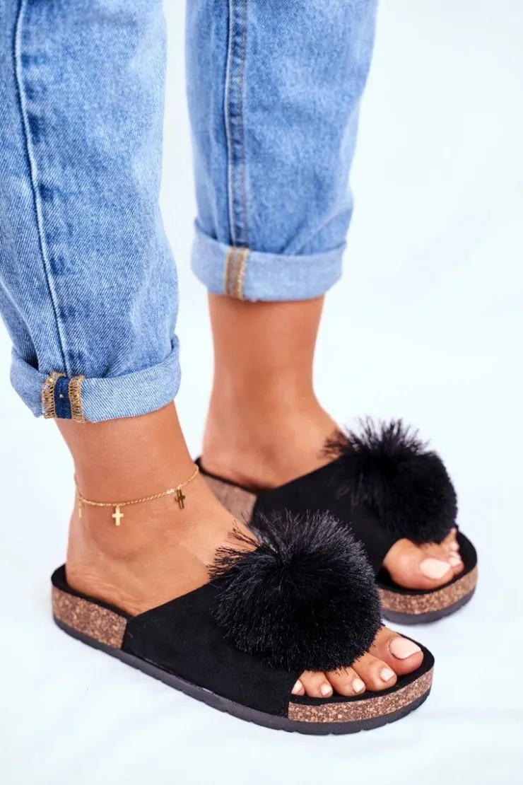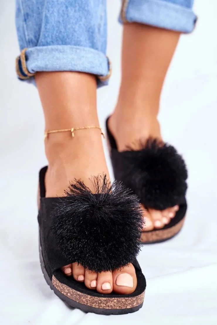 Outlet Boto Damskie Czarne Klapki Na Korku z Pomponem Galaxo