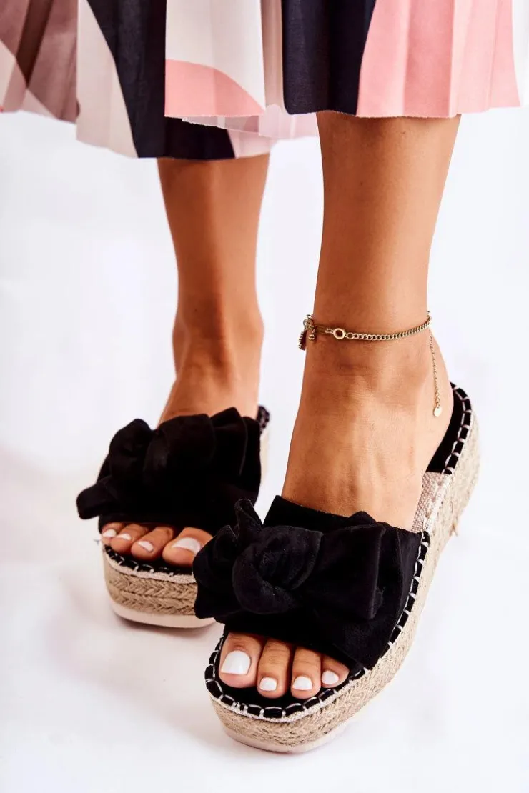 Wygodne klapki wykonane z wysokiej jakości eko zamszu. Wkładka wykonana z połączenia eko zamszu oraz tkaniny. Buty osadzone na platformie wraz z koturnem. Dodatkowo przyozdobione warkoczem z juty. Na przednim pasku znajduje się urocza kokarda. Podeszwa z tworzywa sztucznego. Model idealny na co dzień. Koniecznie powinnaś go mieć! Przy wyborze rozmiaru prosimy sugerować się tabelą rozmiarów.