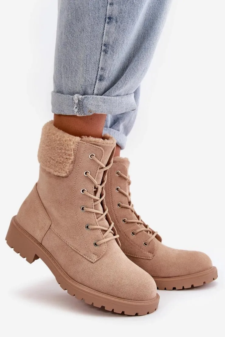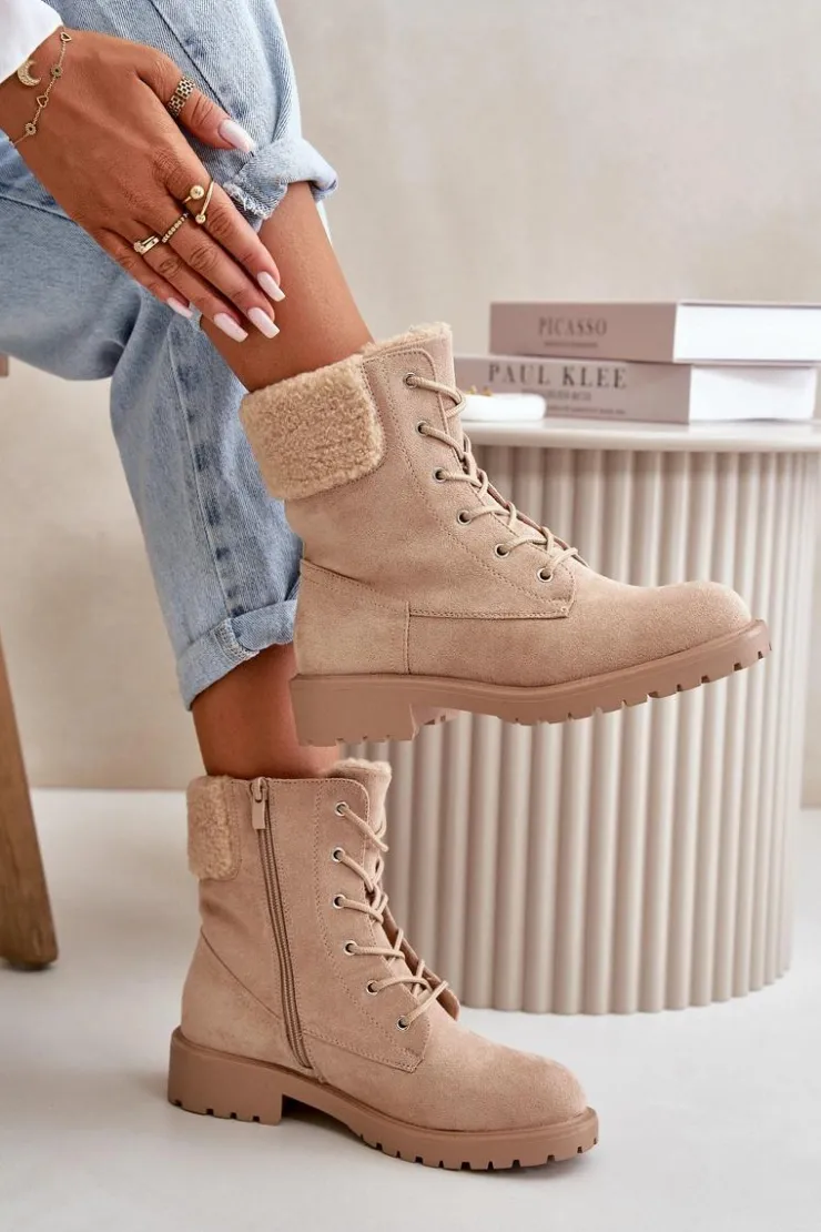 Damskie botki wykonane z miękkiego eko zamszu. Wnętrze ocieplone kocem obuwniczym, co zapewnia komfort w chłodniejsze dni. Góra ozdobiona stylowym kożuszkiem. Model sznurowany, z dodatkowym zapięciem na zamek, co ułatwia zakładanie i dopasowanie do stopy. Idealne na jesienno-zimowe spacery i codzienne stylizacje. Przy wyborze rozmiaru prosimy sugerować się tabelą rozmiarów.