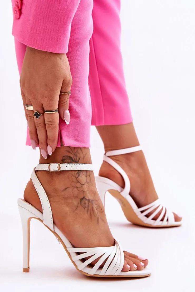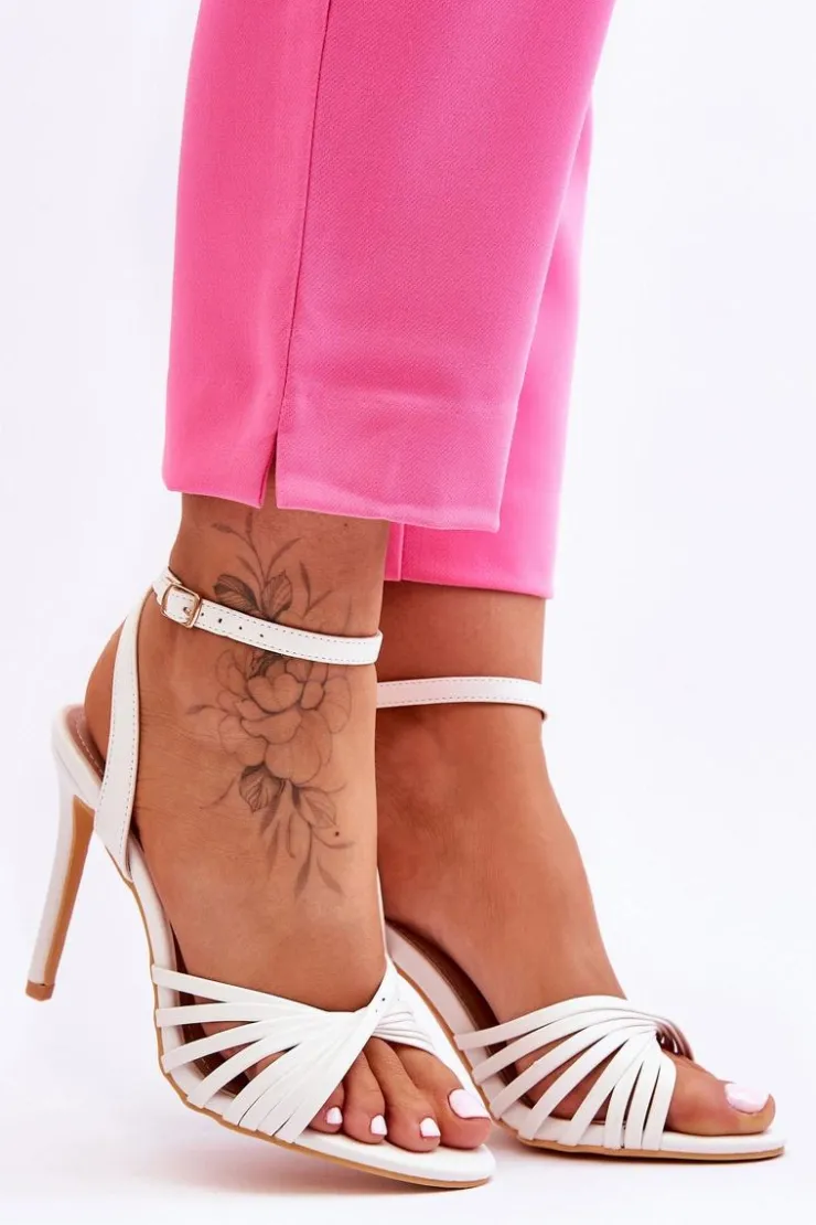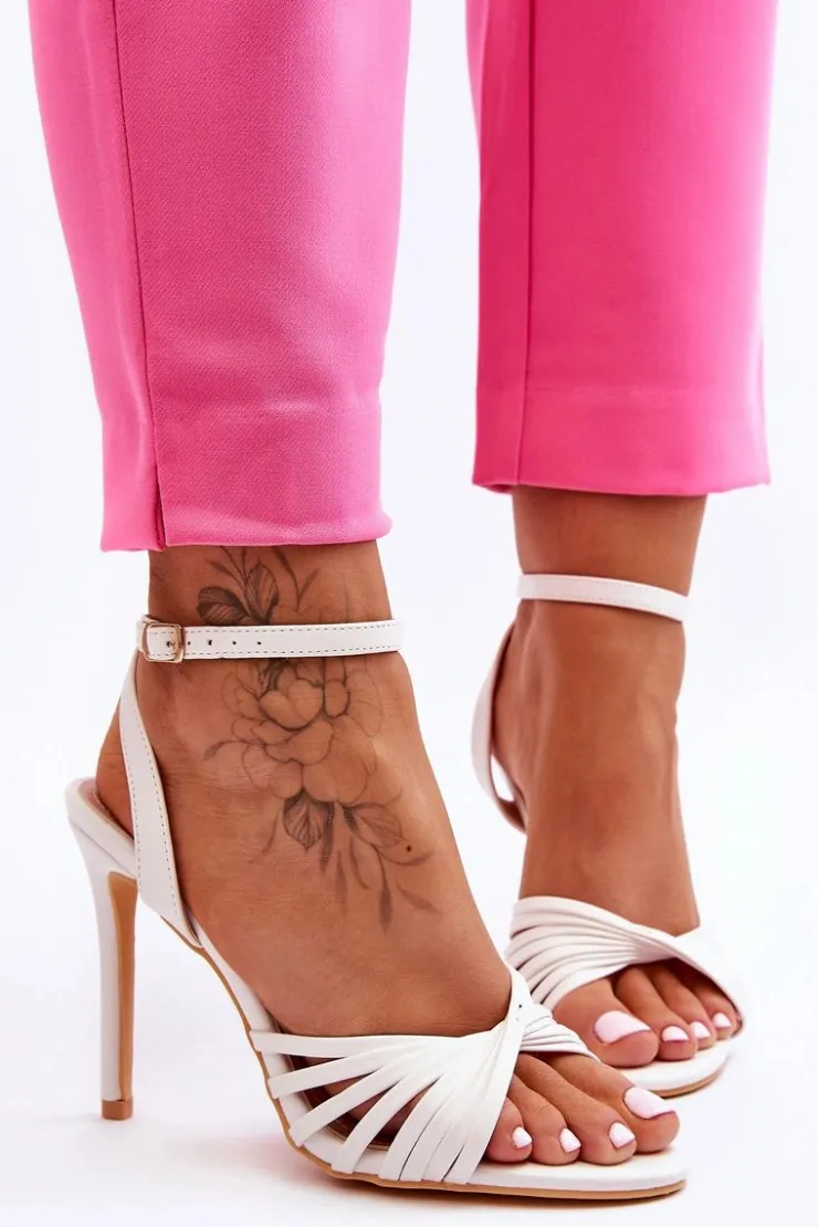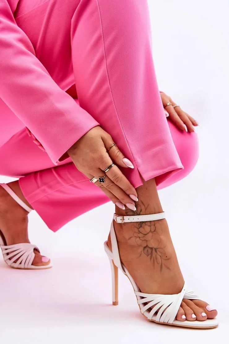Te piękne sandałki damskie osadzono na obcasie w postaci szpilki. Model ten został wykonany z eko skóry. Sandałki posiadają na przodzie związane paseczki. Zapinane wokół kostki na regulowany pasek ze sprzączką. Te eleganckie sandałki z pewnością sprawdzą się w wielu stylizacjach na różnego rodzaju imprezy, spotkania czy uroczystości! Przy wyborze rozmiaru prosimy sugerować się tabelą rozmiarów.