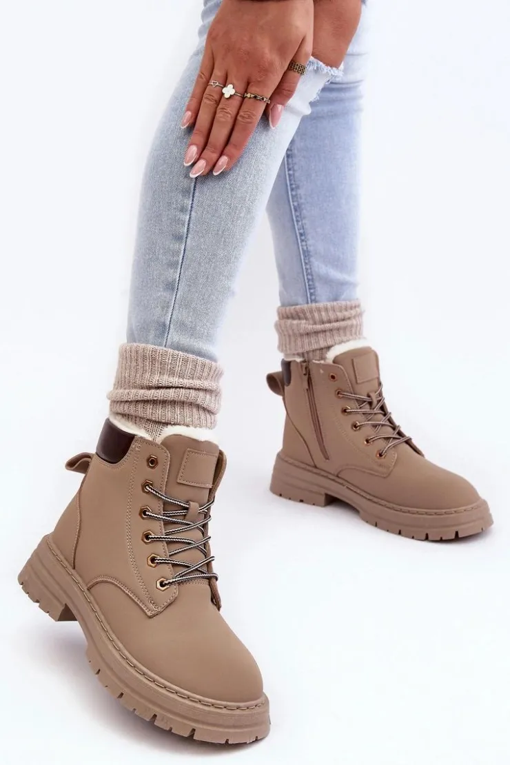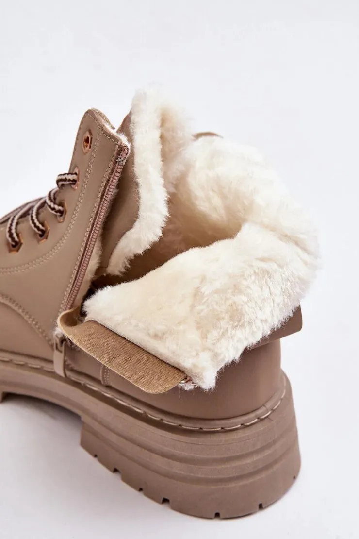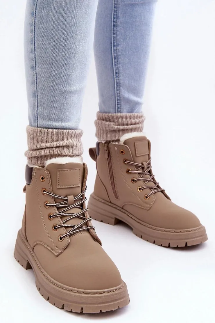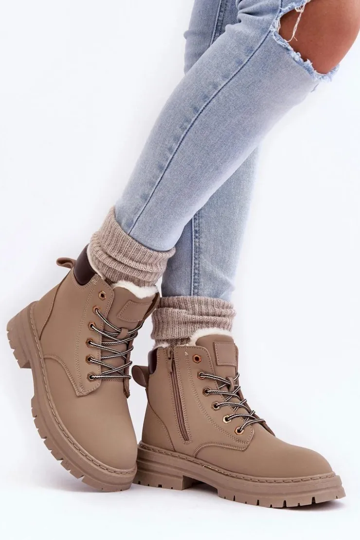 Klasyczne trapery damskie wykonane z eko skóry. Osadzone na platformie i płaskim obcasie. Zapinane na suwak z boku oraz dodatkowo posiadają sznurowanie. Środek ocieplony grubym futerkiem. Ten model traperów zachwyci każdego! Przy wyborze rozmiaru prosimy sugerować się tabelą rozmiarów.
