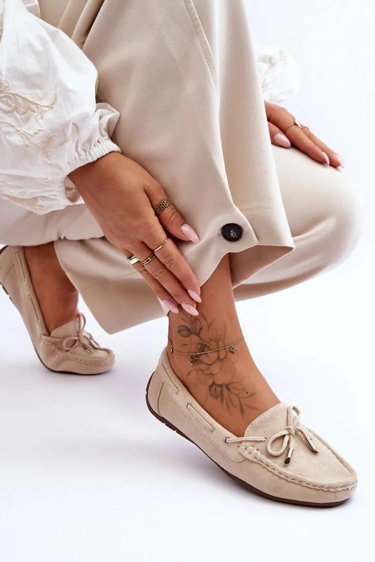 Damskie, klasyczne mokasyny zostały wykonane z eko zamszu. Model ten posiada na przodzie ozdobną kokardkę oraz przeplatające się przez boki cholewki sznureczki. Mokasyny osadzono na antypoślizgowej podeszwie. Miękka wkładka z eko skóry zapewni komfort podczas użytkowania obuwia. Dodatkowo jest delikatnie perforowana. Koniecznie powinnaś je mieć w swojej kolekcji obuwia! Przy wyborze rozmiaru prosimy sugerować się tabelą rozmiarów.