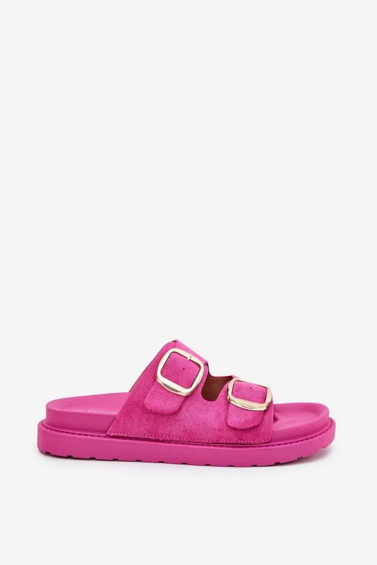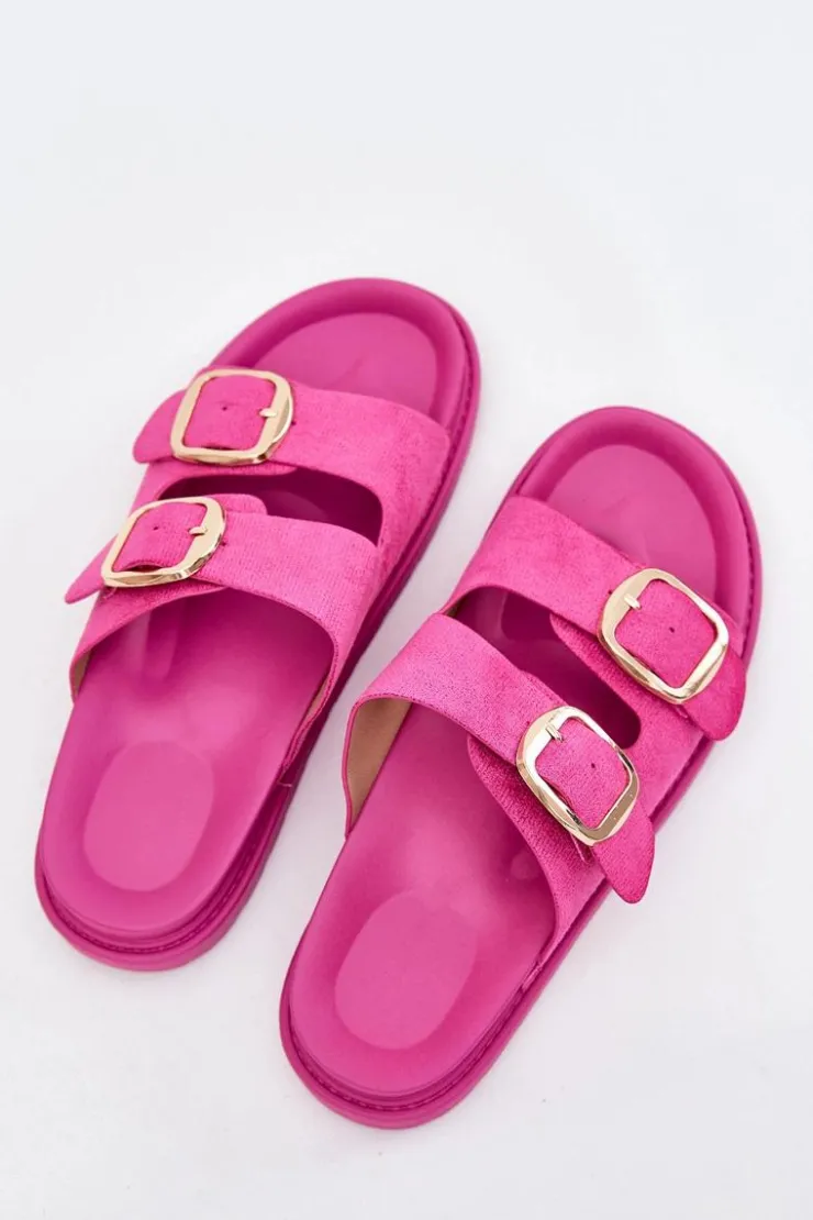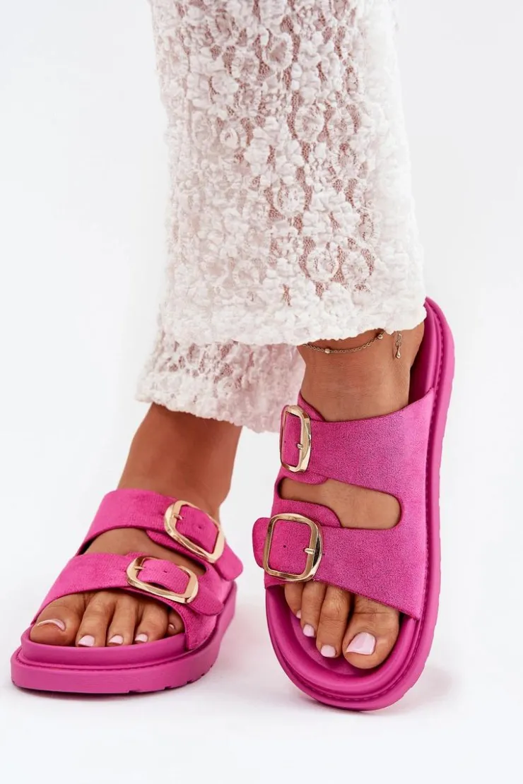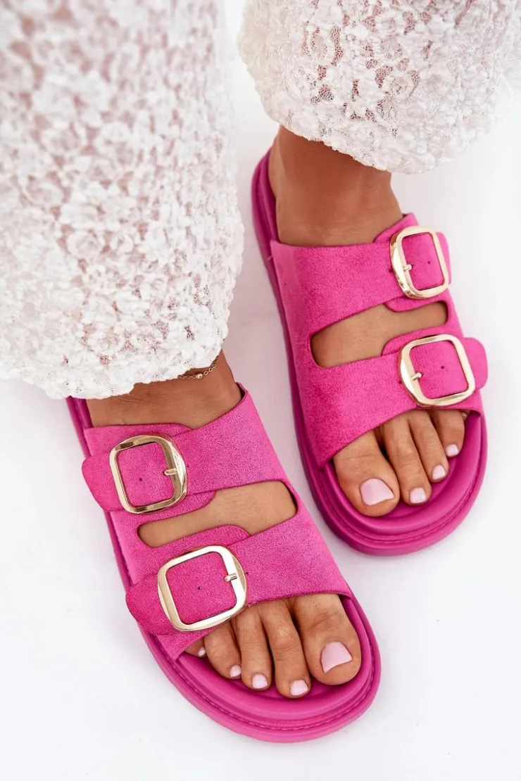 Klapki damskie wykonane z eko zamszu. Osadzone na platformie. Dwa regulowane paski ze złotymi klamrami zapewniają idealne dopasowanie, a profilowana wkładka gwarantuje komfort przez cały dzień. Idealne na codzienne wyjścia. Przy wyborze rozmiaru rosimy sugerować się tabelą rozmiarów.