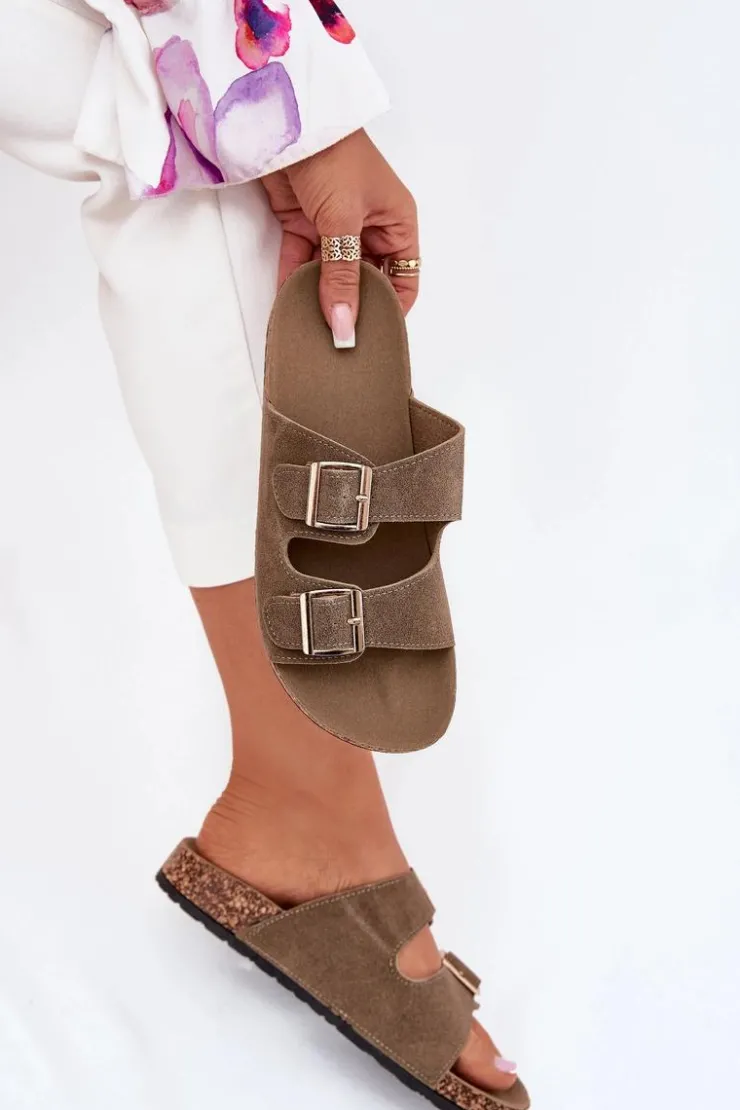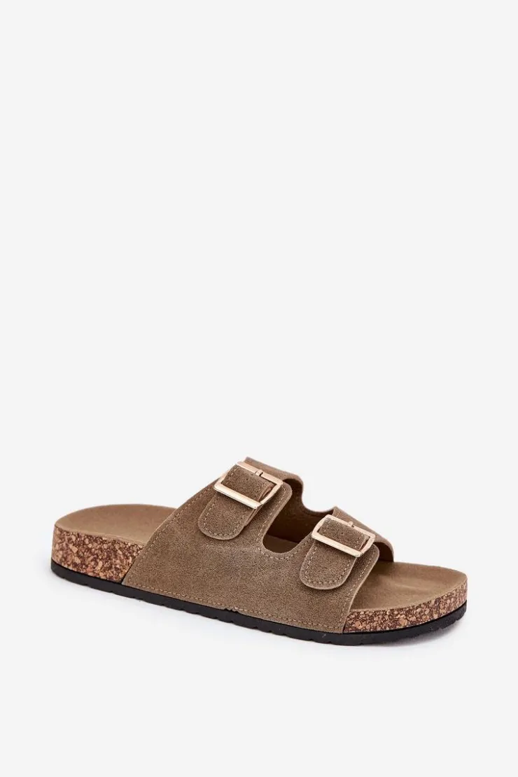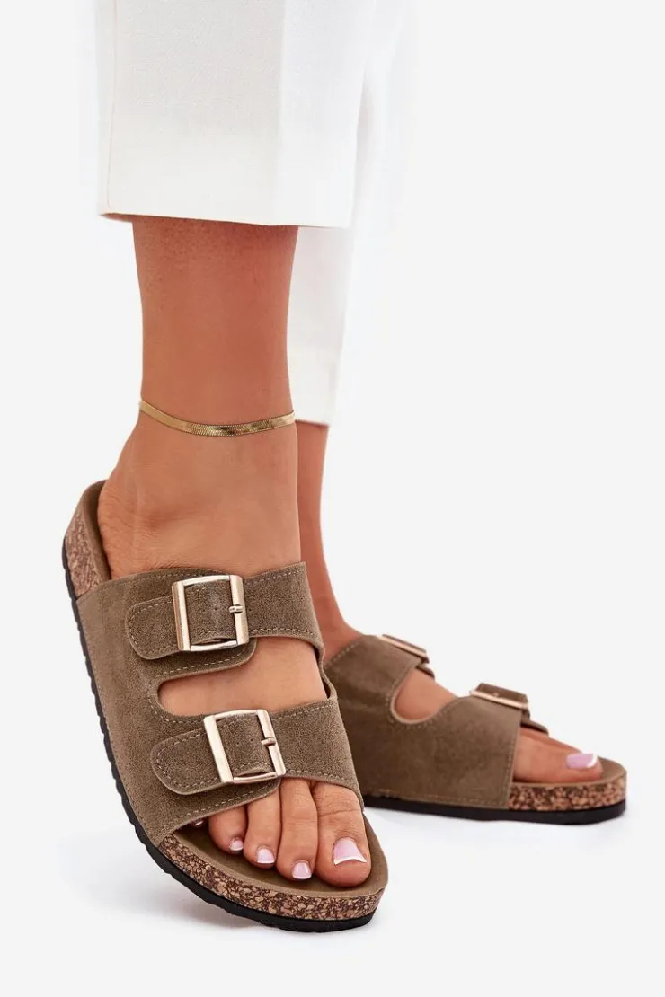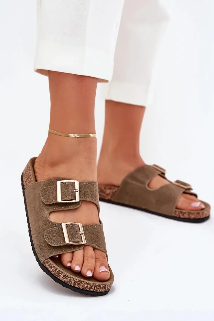 Klapki damskie z eko zamszu, osadzone na korkowej platformie, to połączenie stylu i wygody. Dwie złote klamry z regulowanymi paskami pozwalają na idealne dopasowanie do stopy, a profilowana wkładka zapewnia komfort przez cały dzień. Idealne do letnich stylizacji, doskonale pasują do sukienek, spódnic czy szortów. Przy wyborze rozmiaru prosimy sugerować się tabelą rozmiarów.