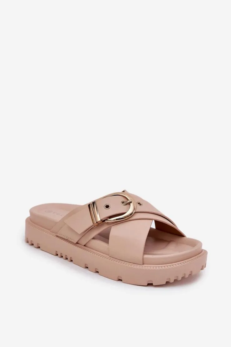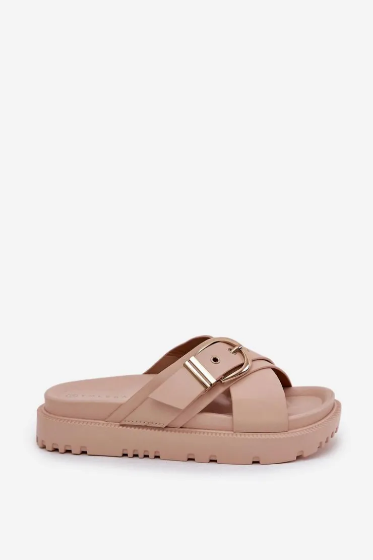 Klapki na platformie wykonane z eko skóry to modna i wygodna propozycja na ciepłe dni. Z przodu znajdują się dwa szerokie, krzyżujące się paski, które dodają nowoczesnego charakteru. Duża klamra na pasku przyciąga uwagę, nadając wyrazistego stylu. Te klapki łączą komfort z eleganckim designem, idealnie pasując do letnich stylizacji. Przy wyborze rozmiaru prosimy sugerować się tabelą rozmiarów.</p
