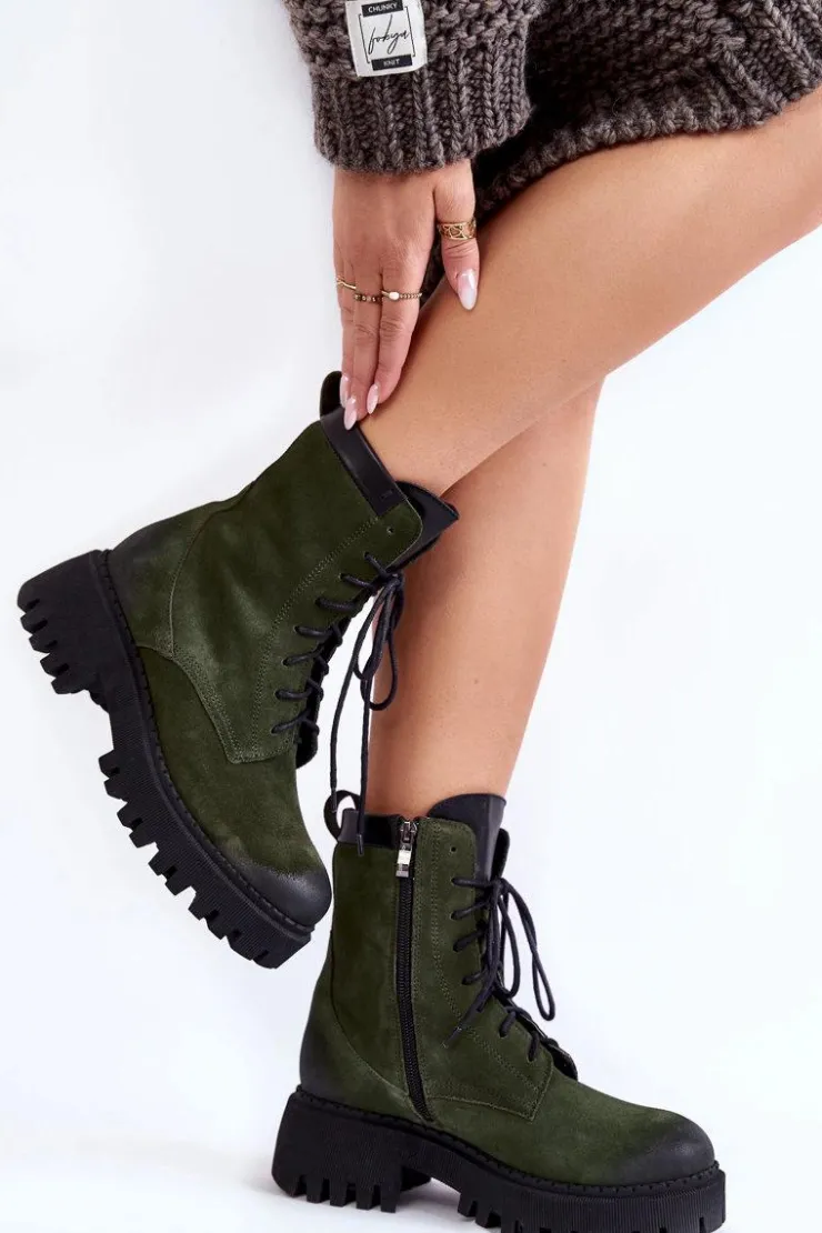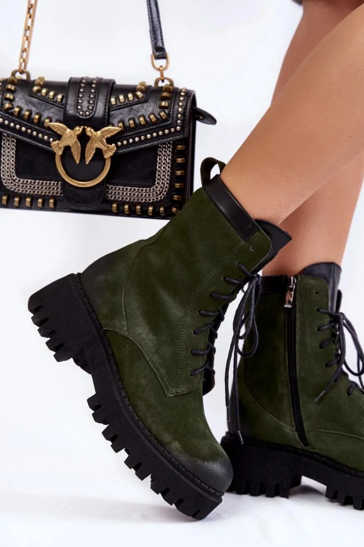 Klasyczne botki damskie zostały wykonane z wysokiej jakości naturalnych skór. Model ten posiada klasyczne sznurowanie oraz suwak z boku cholewki. Modne przetarcia na przodzie oraz tyle buta. Usztywniany zapiętek zapewni stabilizację stopy. Botki zostały ocieplone kocem obuwniczym. Osadzone na płaskim obcasie i platformie ze żłobieniami. Przy wyborze rozmiaru prosimy sugerować się tabelą rozmiarów.
