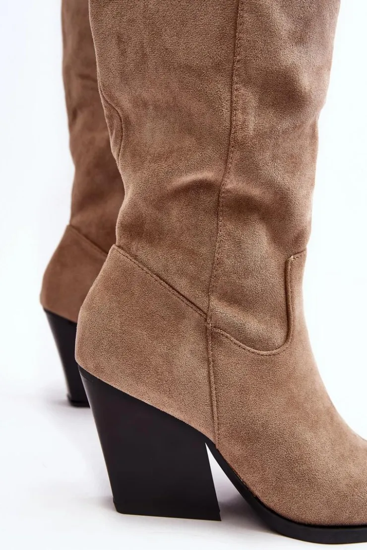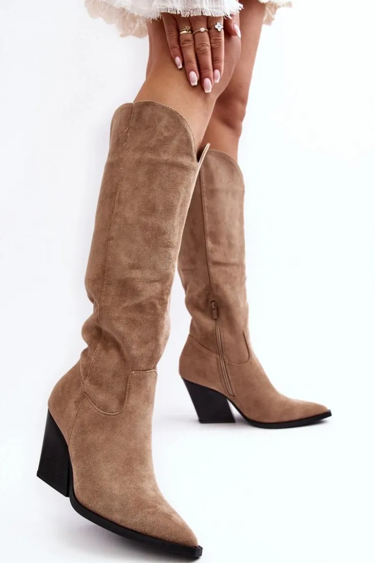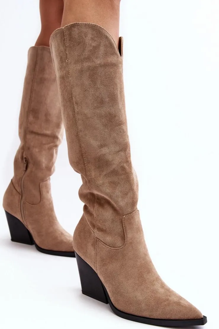 Kozaki damskie zostały wykonane z eko zamszu. Osadzone na obcasie w postaci masywnego słupka. Model ten jest wsuwany i zapinany częściowo na suwak z boku. Zapiętek jest usztywniony. Ten model skradnie serce niejednej miłośniczce kozaków w stylu kowbojek! Koniecznie powinnaś je mieć! Przy wyborze rozmiaru prosimy sugerować się tabelą rozmiarów.