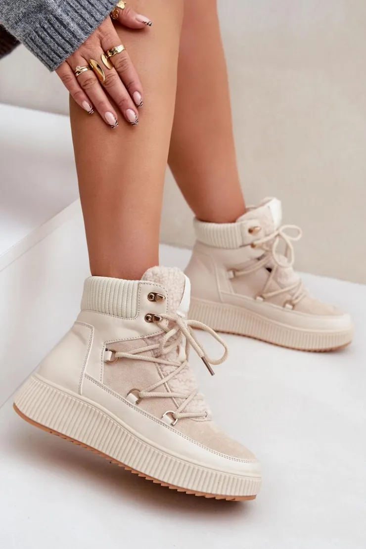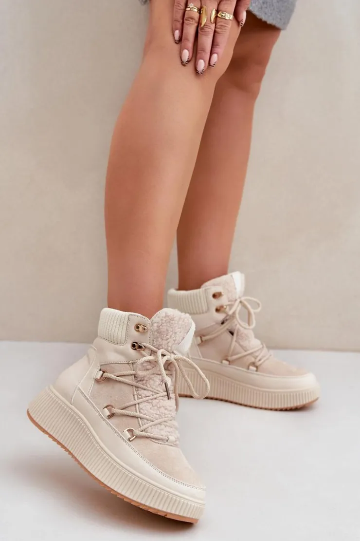 Niskie śniegowce na platformie to idealne obuwie na zimowe dni. Model wyróżnia się językiem ozdobionym miękkim futerkiem typu baranek, które nadaje mu przytulny i stylowy wygląd. Środek ocieplany kocem obuwniczym. Sznurowanie z dodatkowymi haczykami pozwala na precyzyjne dopasowanie butów do stopy. Funkcjonalne, modne i komfortowe – doskonałe na zimowe spacery i codzienne stylizacje. Przy wyborze rozmiaru prosimy sugerować się tabelą rozmiarów.