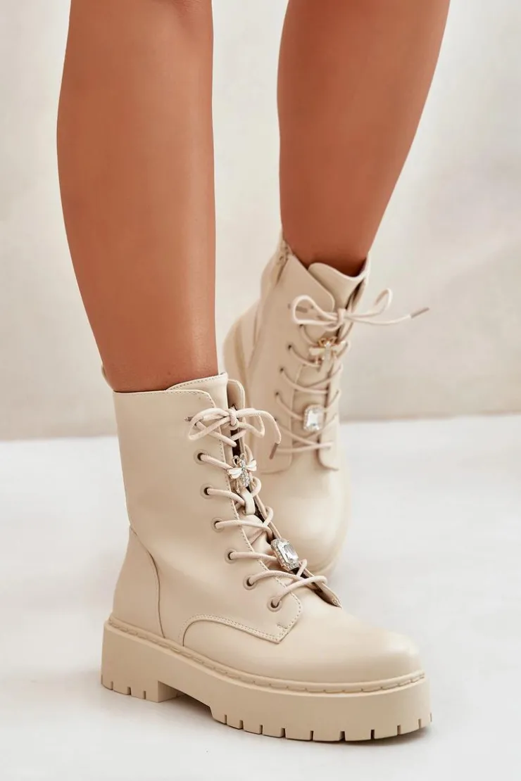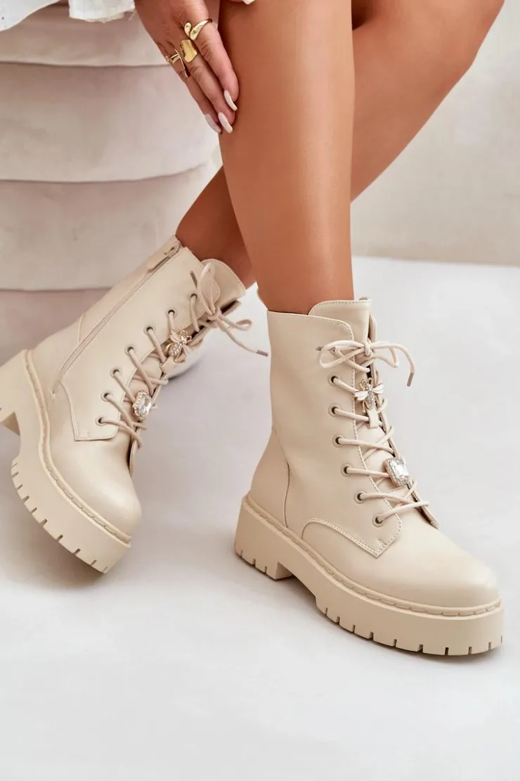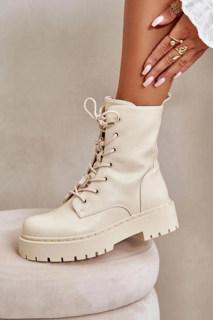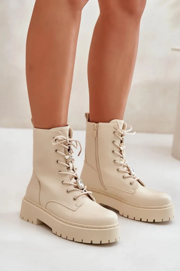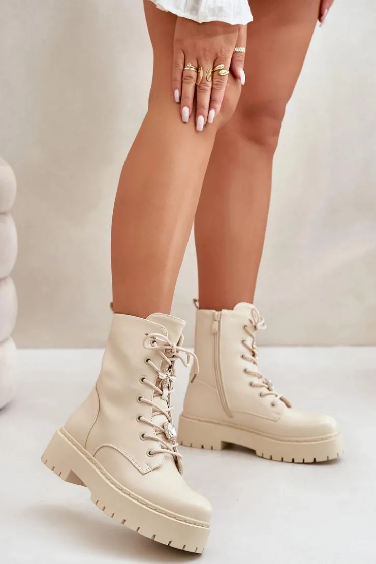 Damskie botki wykonane z ekologicznej skóry. Posiadają płaski obcas i zaokrąglone noski, co zapewnia komfort noszenia. Dzięki bocznemu suwakowi zakładanie jest szybkie i proste, a dodatkowe sznurowanie z ozdobnymi przypinkami dodaje unikalnego charakteru. Środek ocieplony kocem obuwniczym. Doskonale uzupełnią Twoje outfity w chłodniejsze dni.Przy wyborze rozmiaru prosimy sugerować się tabelą rozmiarów.