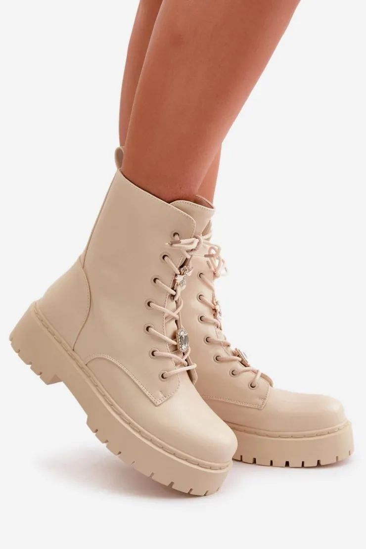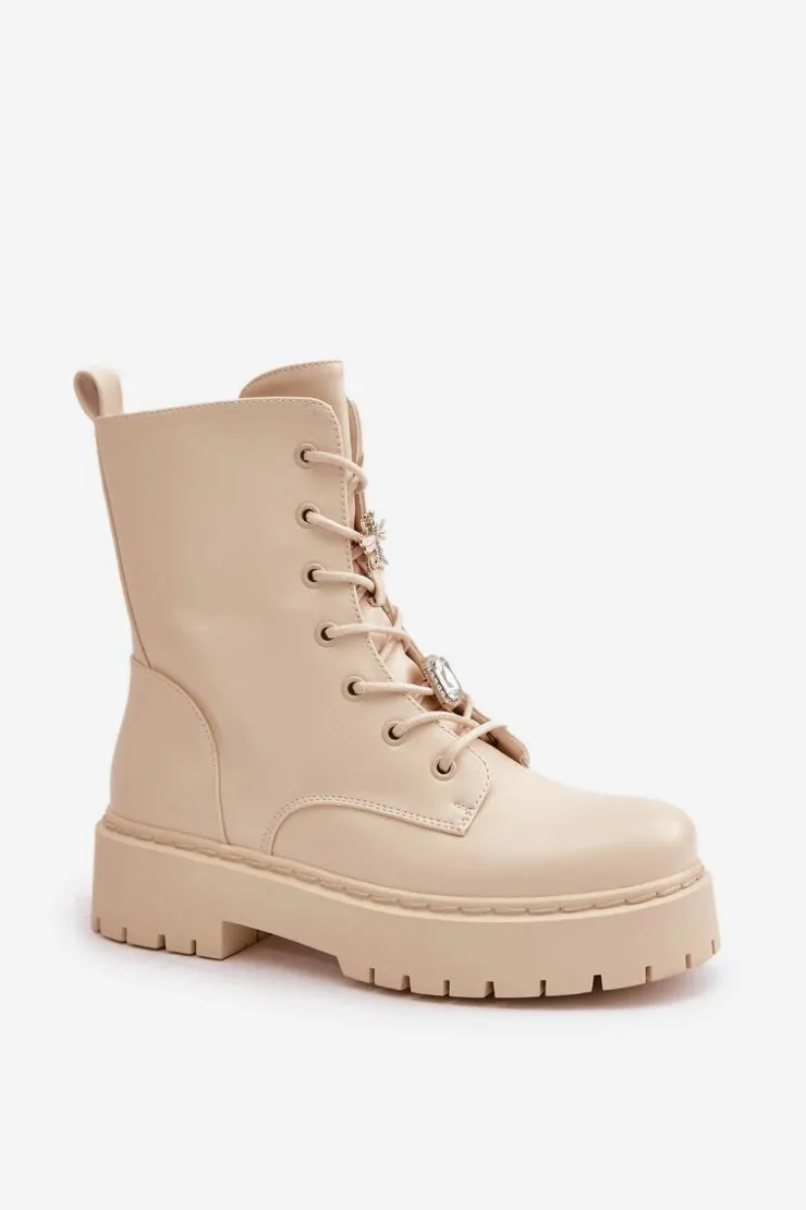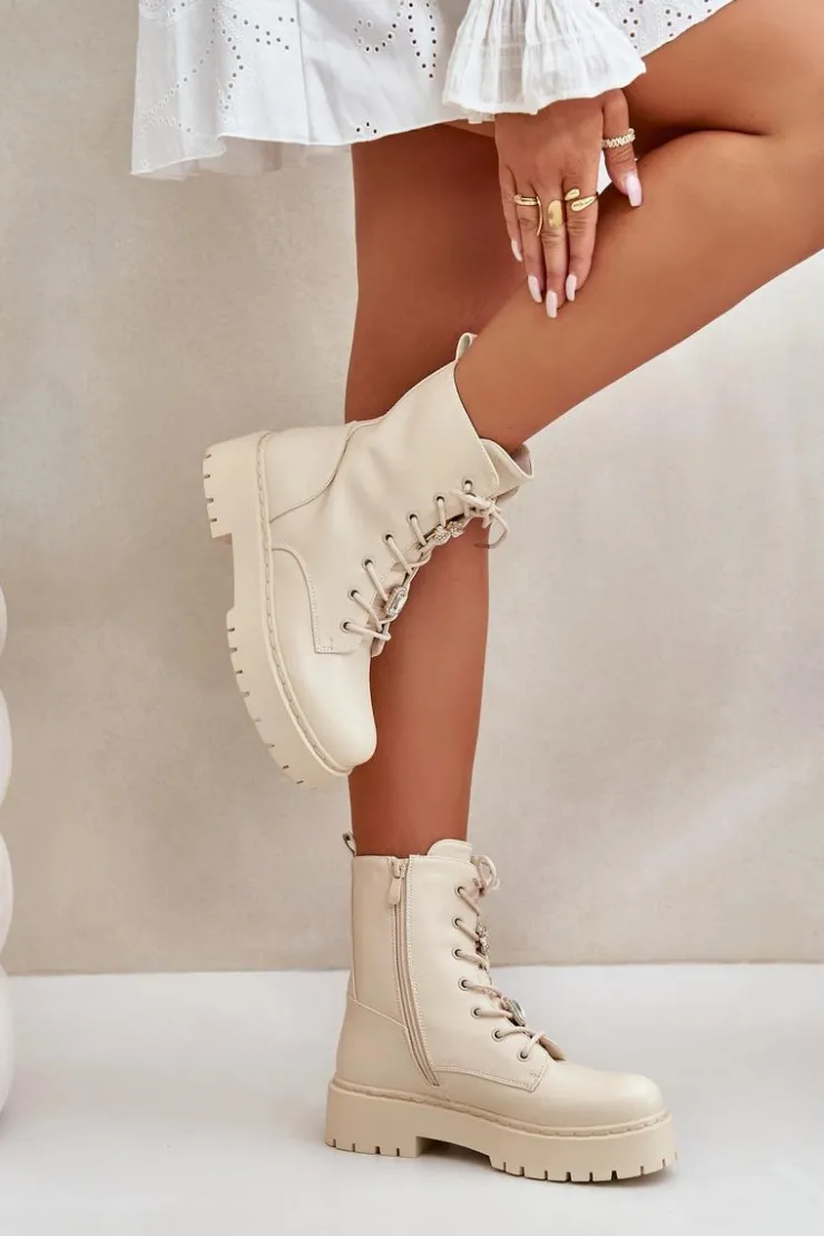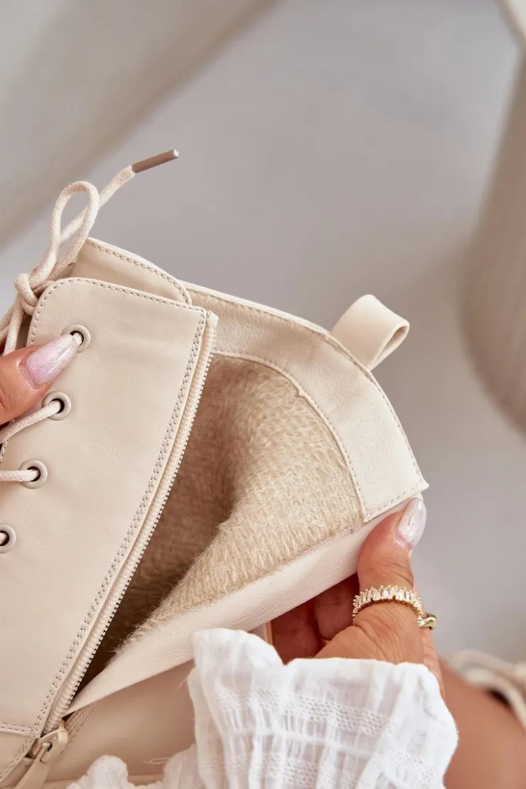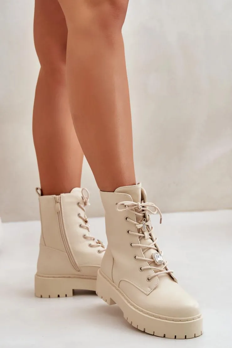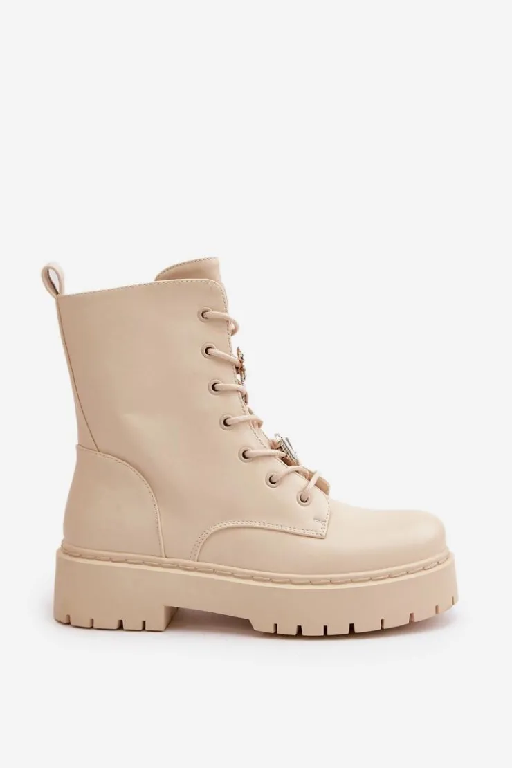 Damskie botki wykonane z ekologicznej skóry. Posiadają płaski obcas i zaokrąglone noski, co zapewnia komfort noszenia. Dzięki bocznemu suwakowi zakładanie jest szybkie i proste, a dodatkowe sznurowanie z ozdobnymi przypinkami dodaje unikalnego charakteru. Środek ocieplony kocem obuwniczym. Doskonale uzupełnią Twoje outfity w chłodniejsze dni.Przy wyborze rozmiaru prosimy sugerować się tabelą rozmiarów.