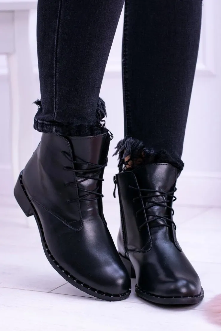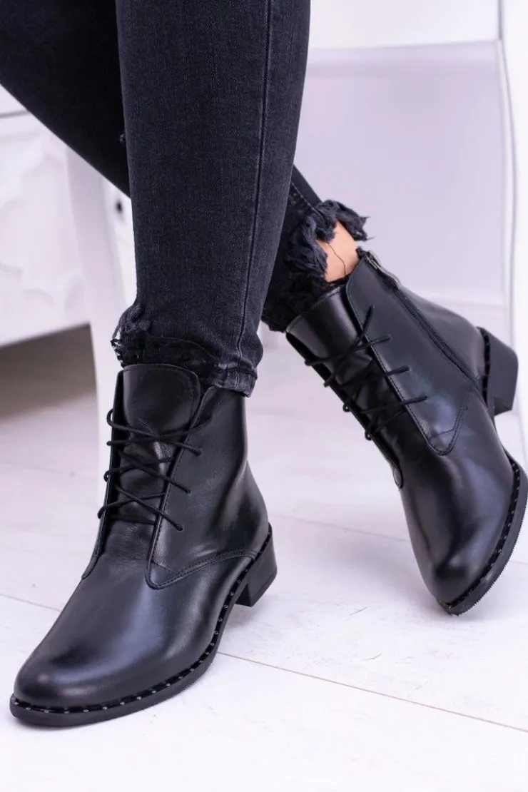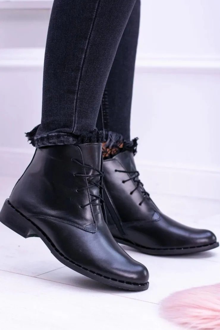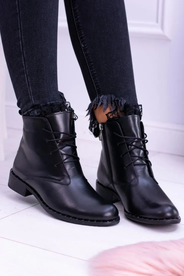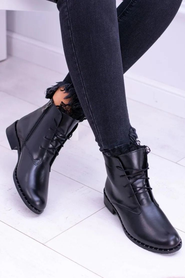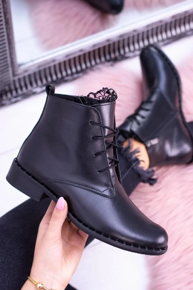 Outlet Boto Ocieplane Skórzane Czarne Damskie Botki Z Koronką Millano