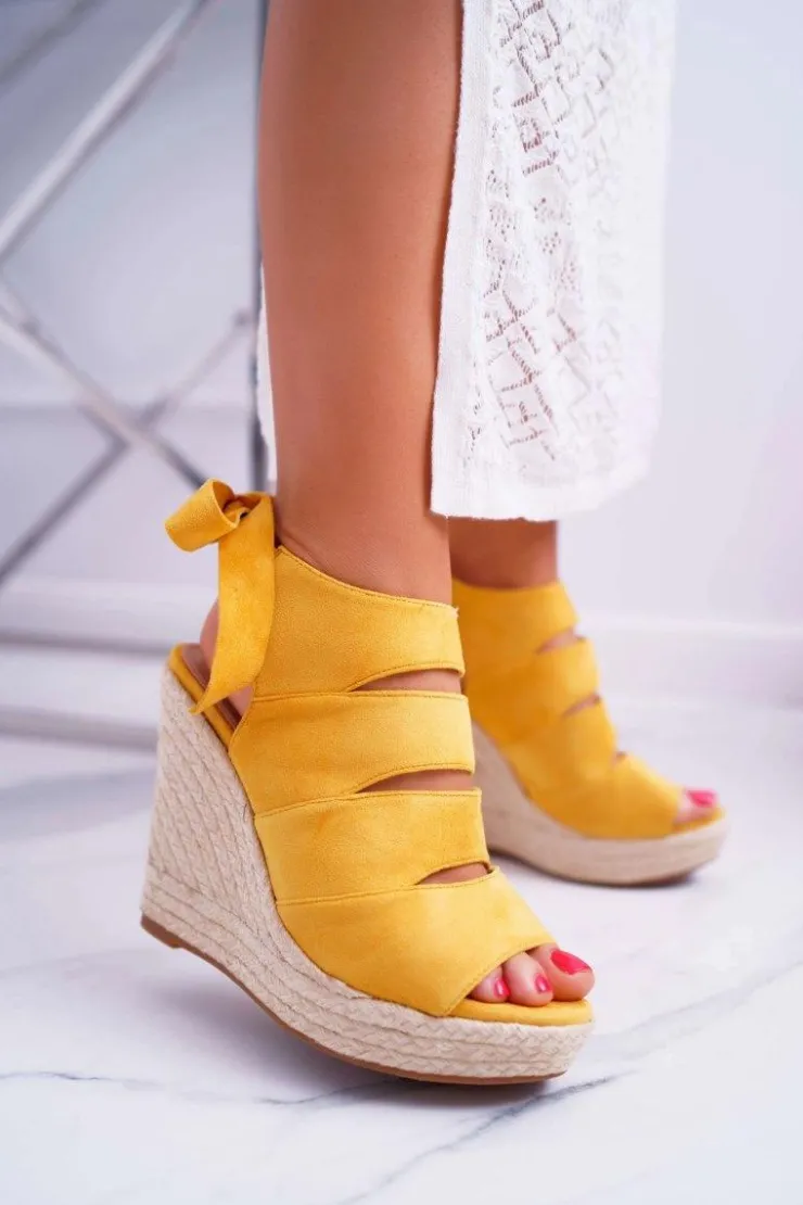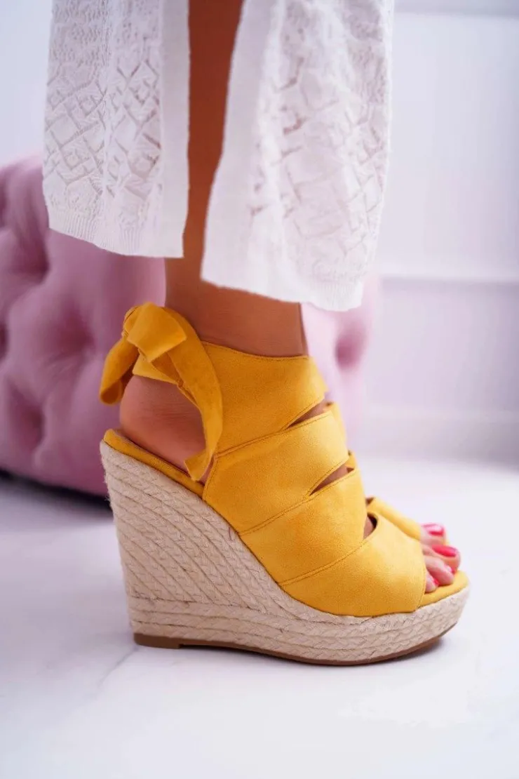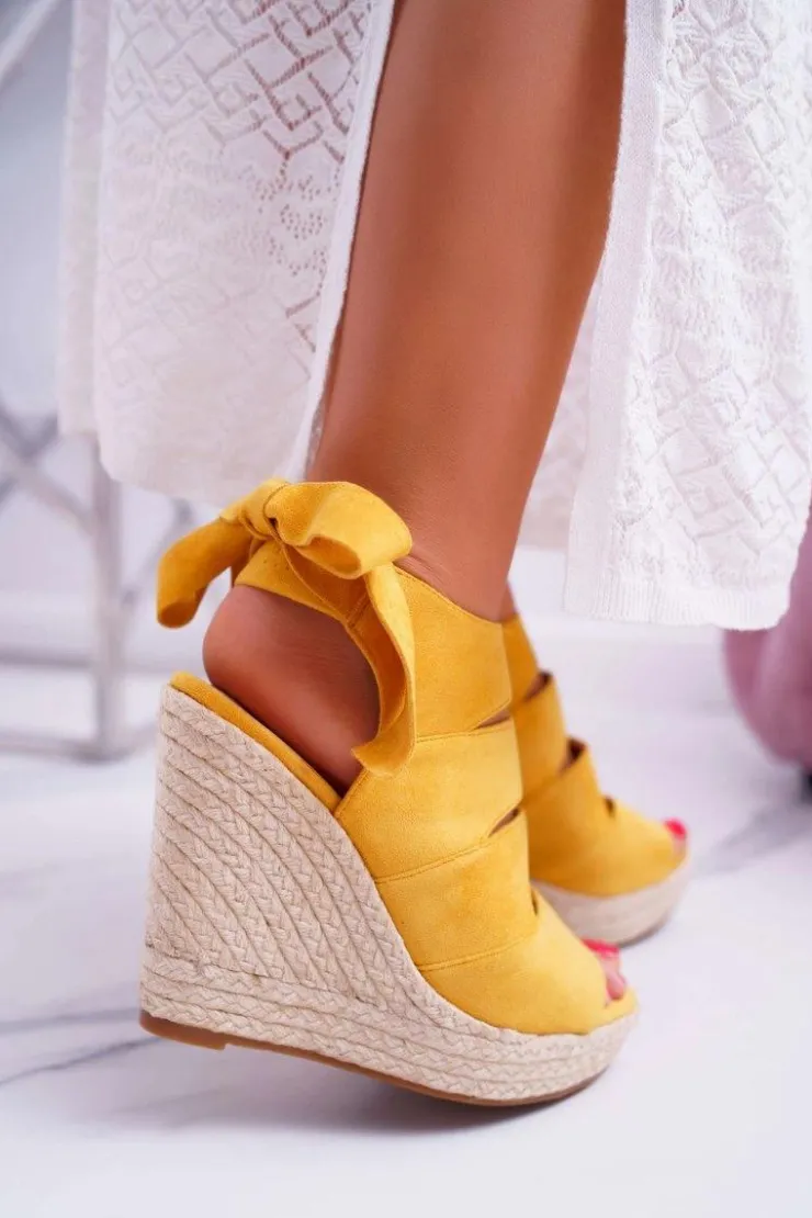 Outlet Boto Sandały Damskie Na Koturnie Lniane Wiązane Żółte Cantare