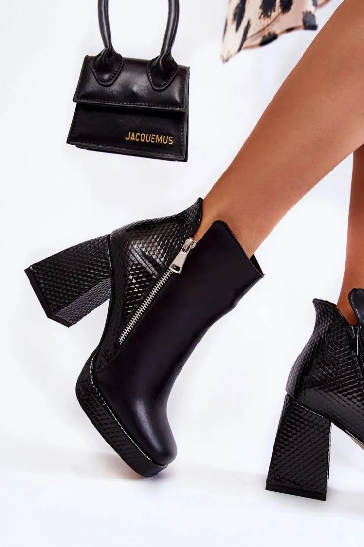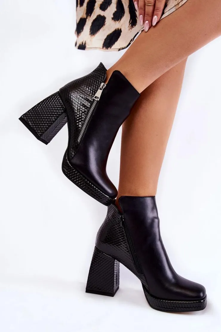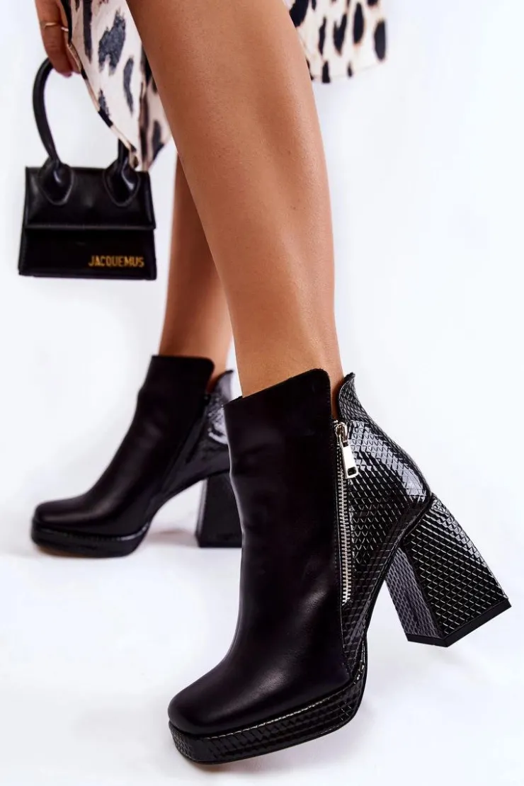 Botki zostały wykonane z naturalnej skóry z dbałością o detale. Ocieplone w środku kocem obuwniczym. Botki zostały osadzone na masywnym obcasie w postaci klocka oraz delikatnej platformie. Zapinane na suwak. Usztywniany zapiętek zapewni stabilizację stopy. Botki dodatkowo posiadają ozdobny zamek po zewnętrznej stronie cholewki. Ten modny fason powinien znaleźć się w Twojej szafie! Przy wyborze rozmiaru prosimy sugerować się tabelą rozmiarów.