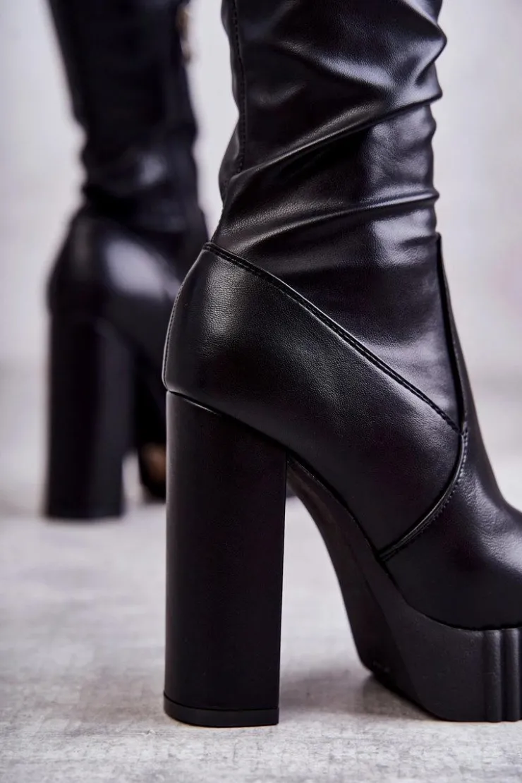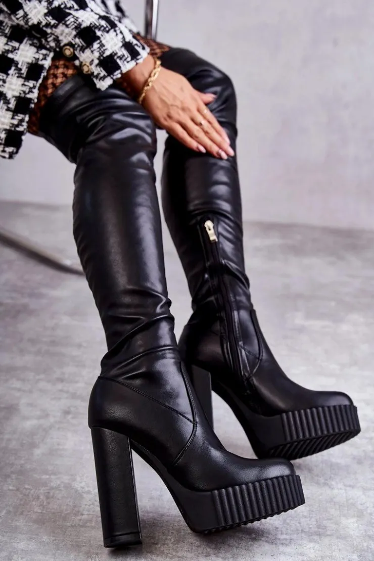 Wyjątkowe kozaki damskie z cholewką za kolano wykonaną z eko skóry. Model wsuwany, z dodatkowym suwakiem z boku cholewki. Kozaki osadzono na platformie oraz obcasie w postaci słupka. W środku ocieplone kocem obuwniczym. Dodatkowo posiadają usztywniany zapiętek. Świetnie będą prezentować się ze spódniczkami oraz sukienkami mini. Przy wyborze rozmiaru prosimy sugerować się tabelą rozmiarów.