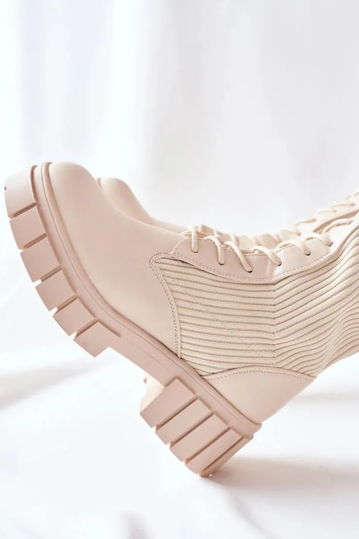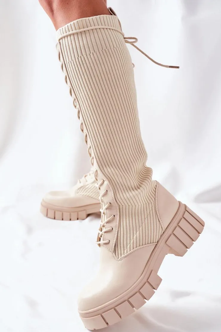 Wysokie sznurowane kozaki. Cholewka w postaci skarpety. Sznurowanie po całej długości zapewni odpowiednie dopasowanie do nogi. Przy wyborze rozmiaru prosimy sugerować się tabelą rozmiarów.
