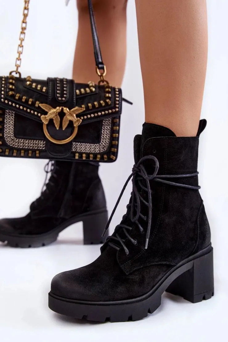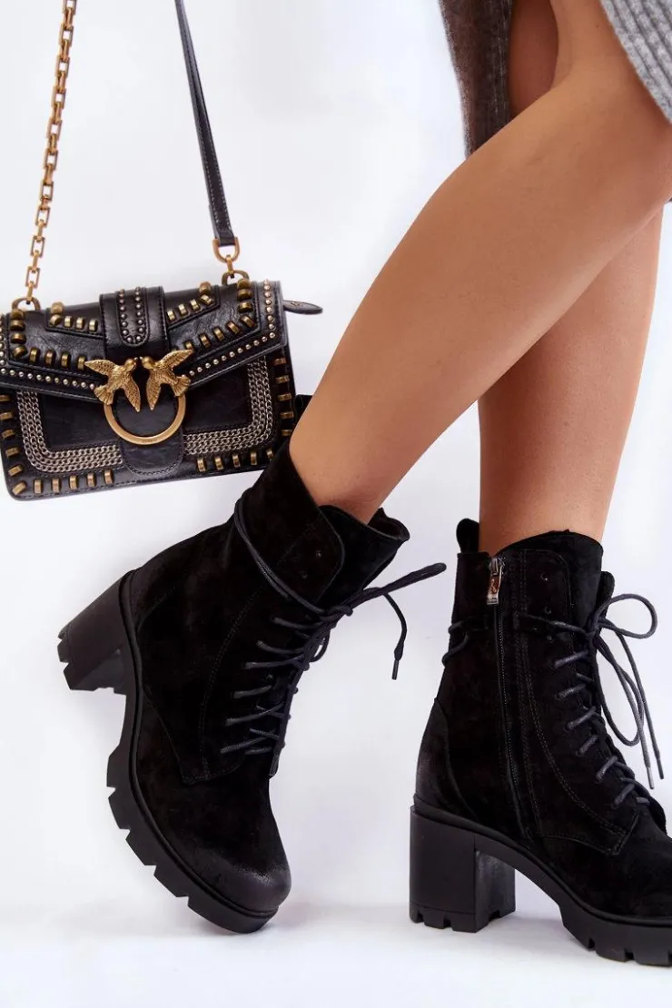 Damskie botki osadzono na masywnej platformie z szerokim obcasem w postaci słupka. Posiadają wysoką, sięgającą ponad kostkę cholewkę. Wykonane z naturalnych skór wysokiej jakości. Buty zostały ocieplone kocem obuwniczym. Model z solidnym sznurowaniem. Dodatkowo zamykane na suwak. Botki doskonale sprawdzą się w jesiennych stylizacjach. Przy wyborze rozmiaru prosimy kierować się tabelą rozmiarów
