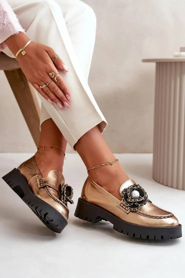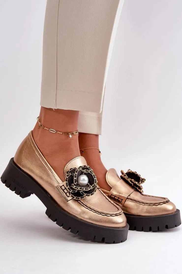 Śliczne damskie mokasyny wykonano z wysokiej jakości skóry naturalnej, gwarantując trwałość i komfort noszenia. Płaski obcas i platforma zapewniają stabilność i wygodę. Skórzana wkładka dodatkowo podnosi komfort noszenia. Ozdobny kwiatek na pasku nadaje subtelny akcent. Model ten doskonale uzupełni wiele stylizacji! Przy wyborze rozmiaru prosimy sugerować się tabelą rozmiarów.