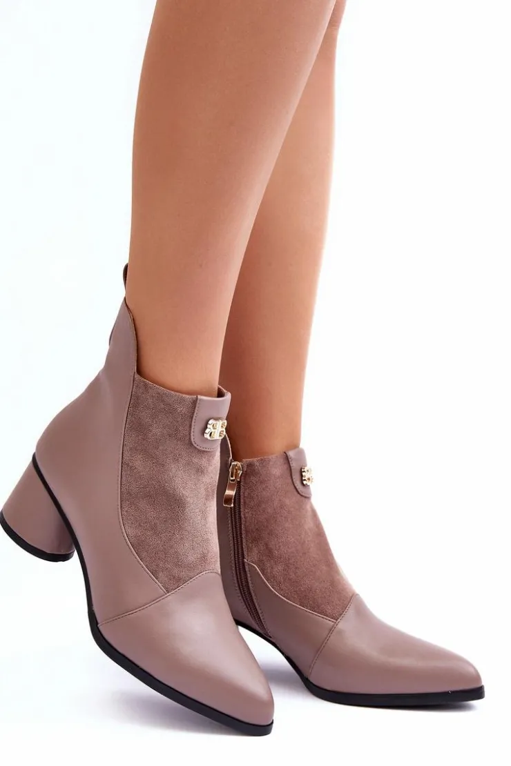 Eleganckie botki damskie wykonane z połączenia eko zamszu i eko skóry. Osadzone na niskim obcasie. Noski w szpic optycznie wysmuklą nogi. Środek ocieplony kocem obuwniczym. Miękka wkładka zapewni komfortowe użytkowanie obuwia. Model ten zapinany jest na suwak z boku cholewki. Idealne na sezon jesienno-zimowy. Przy wyborze rozmiaru prosimy sugerować się tabelą rozmiarów.