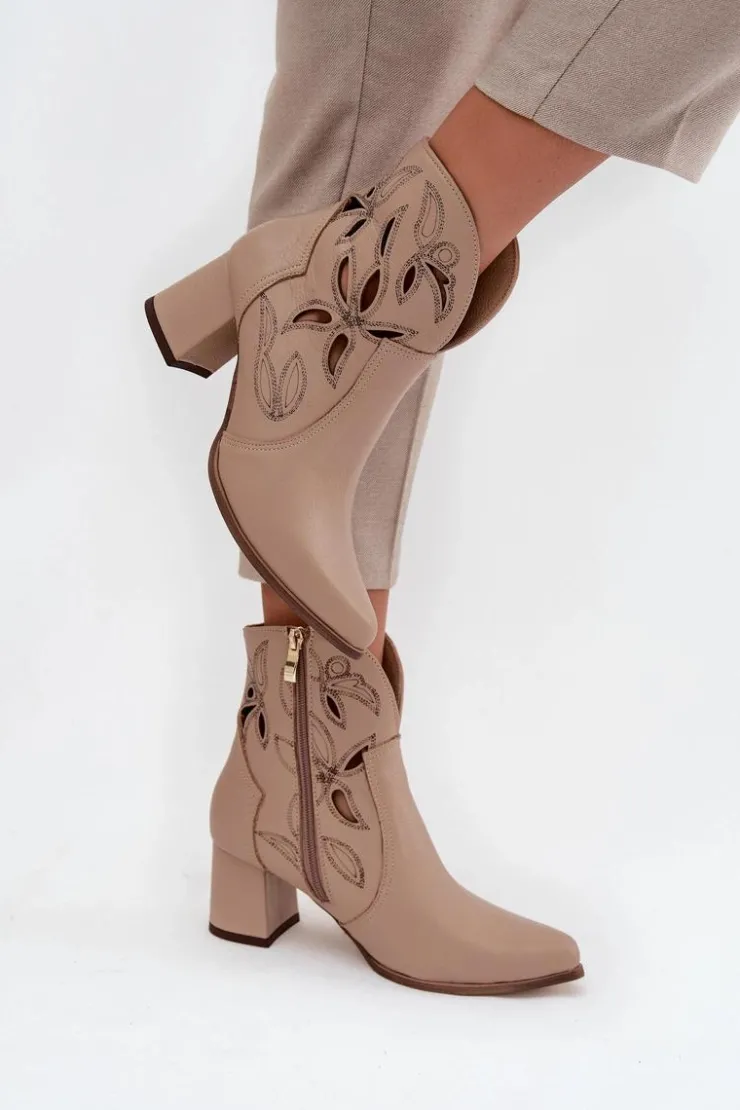 Botki damskie wykonane z naturalnej skóry. Ażurowy wzór dodaje im oryginalności i lekkości, podkreślając wyjątkowy charakter tego modelu. Obcas typu słupek zapewnia stabilność i wygodę, a jednocześnie pięknie wydłuża sylwetkę. Szpiczaste noski wprowadzają elegancki akcent, sprawiając, że buty prezentują się niezwykle zgrabnie. Dzięki zapięciu na zamek są łatwe w zakładaniu i zdejmowaniu, co zwiększa komfort codziennego użytkowania. To obuwie idealne na sezon przejściowy, które świetnie uzupełni zarówno casualowe, jak i bardziej eleganckie zestawy. Przy wyborze rozmiaru prosimy sugerować się tabelą rozmiarów.