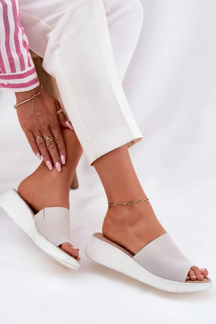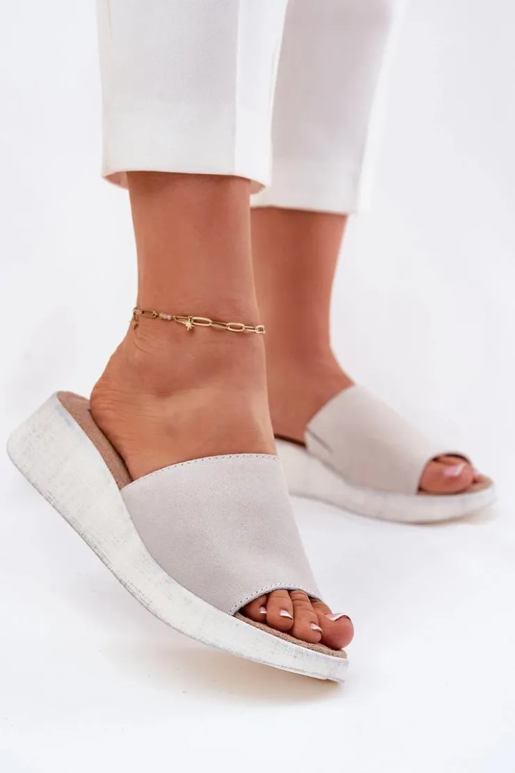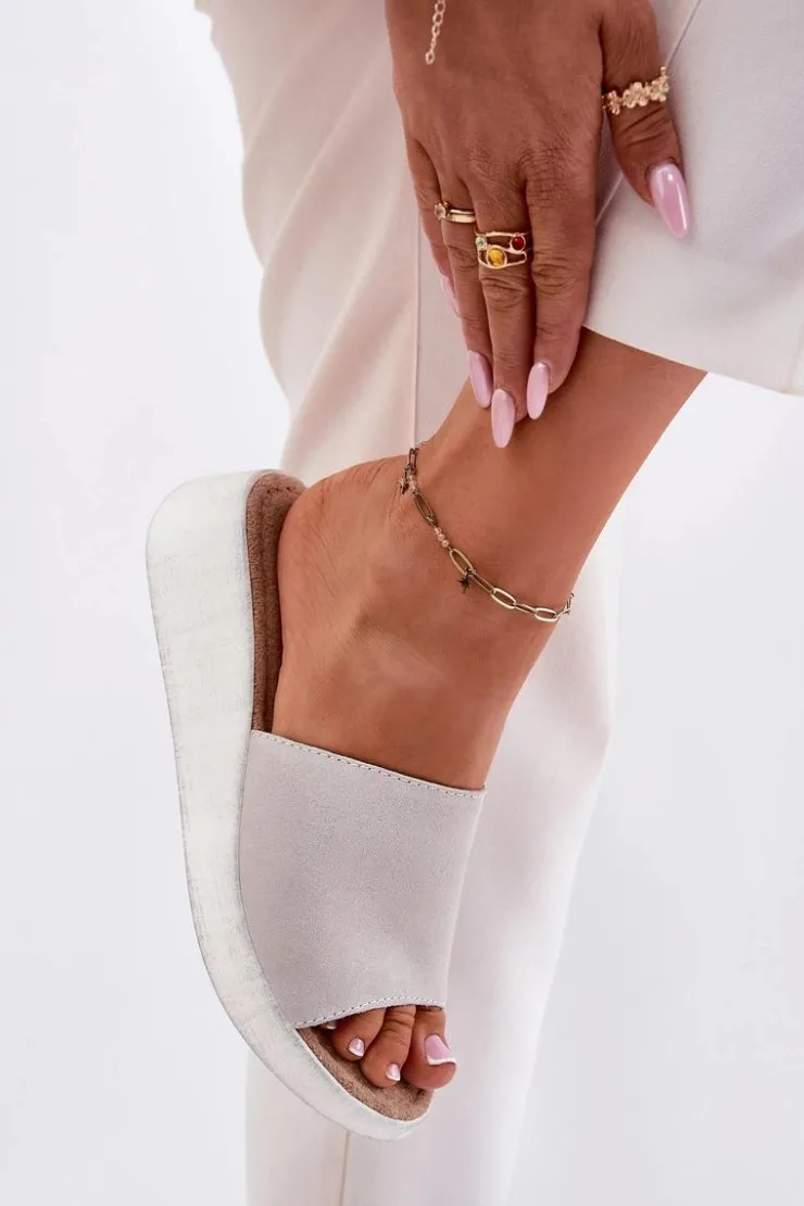 Damskie klapki wykonane z naturalnego zamszu to elegancka opcja na ciepłe dni. Osadzone na koturnie, zapewniają wygodę oraz stabilność przez cały dzień. Miękka wkładka dba o komfort stóp, czyniąc je idealnym wyborem do codziennych, letnich stylizacji. Te klapki łączą styl z funkcjonalnością, doskonale uzupełniając casualowe i bardziej eleganckie looki. Przy wyborze rozmiaru prosimy sugerować się tabelą rozmiarów.