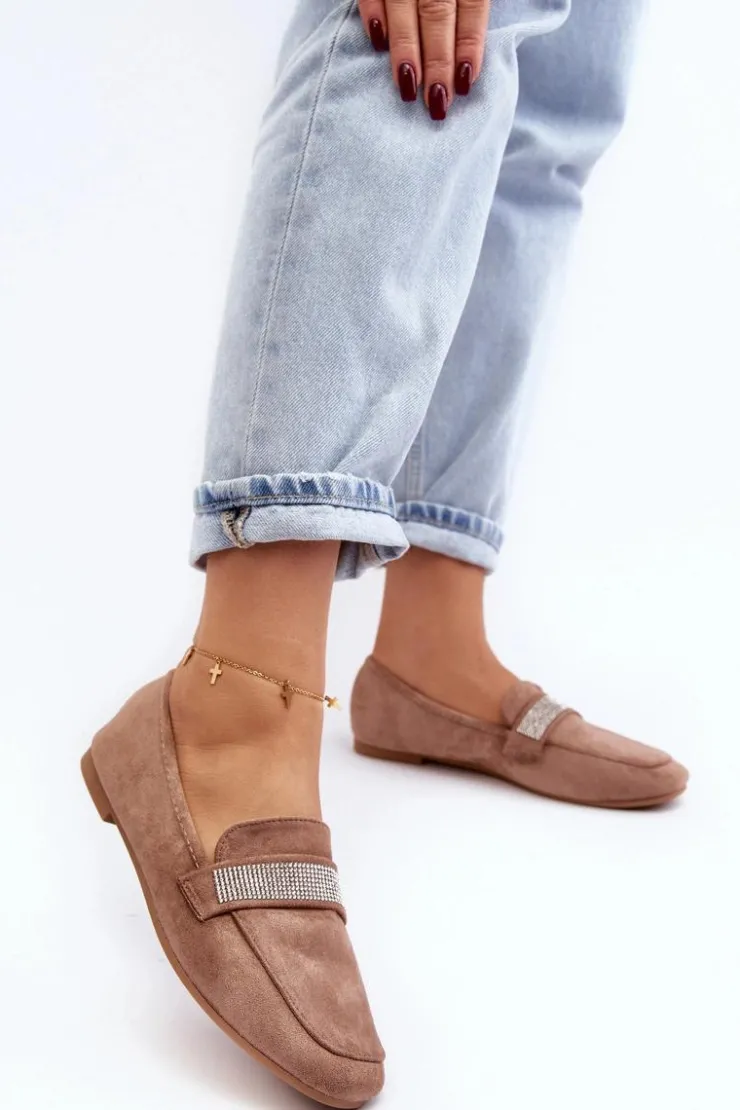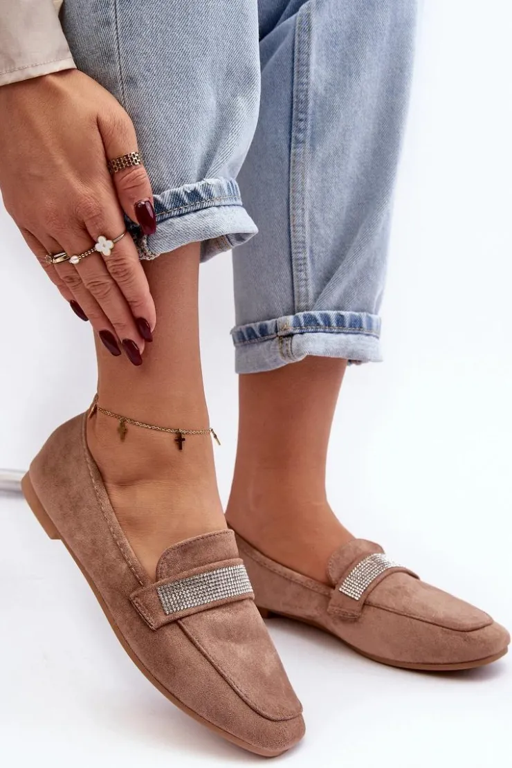 Mokasyny damskie wykonane z eko zamszu. Osadzone na płaskim obcasie. Noski zaokrąglone. Z przodu na pasku liczne, małe cyrkonie. Miękka i profilowana wkładka z eko skóry gwarantuje komfort noszenia przez cały dzień. Stylowe mokasyny to niezbędny element kobiecej garderoby! Koniecznie musisz je mieć! Przy wyborze rozmiaru prosimy sugerować się tabelą rozmiarów.